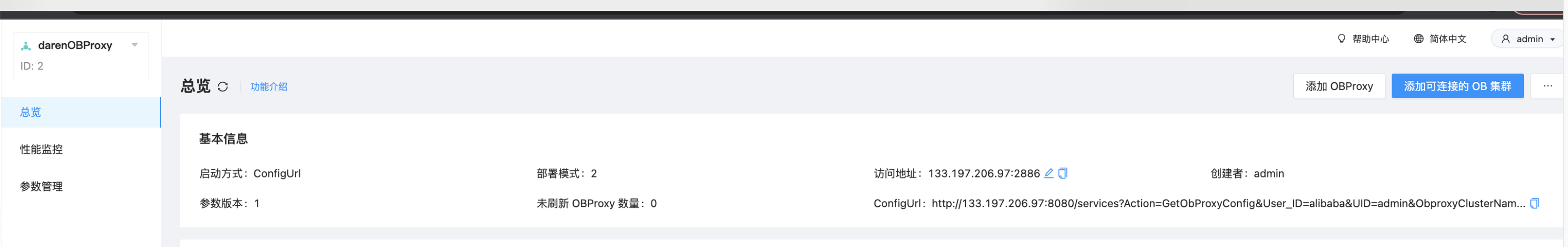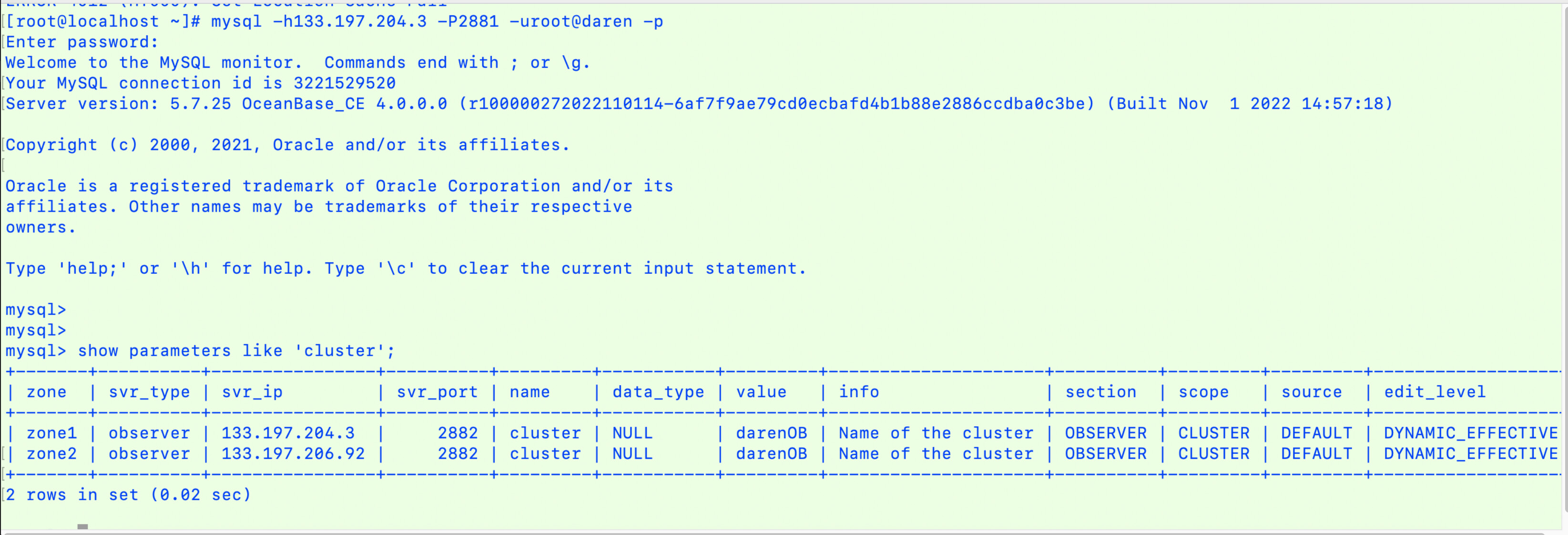 ocp集群中并未创建obproxy,通过直连observer,obclient -h133.197.204.3 -P2881 -uroot@daren -p查看到集群名称darenOB