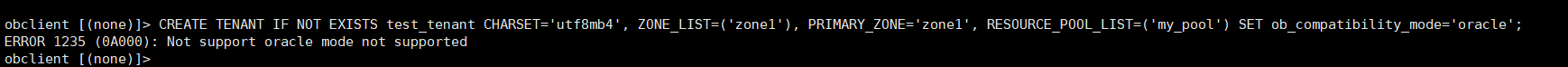 【问题描述】创建oracle 租户CREATE TENANT IF NOT EXISTS test_tenant CHARSET=‘utf8mb4’, ZONE_LIST=(‘zone1’), PRIMARY_ZONE=‘zone1’, RESOURCE_POOL_LIST=(‘my_pool’) SET ob_compatibility_mode=‘oracle’;