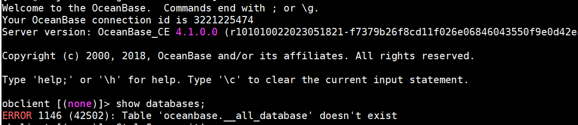 1.用obd cluster start demo起数据库,数据库初始化正常,show databases命令可以看到库。停掉demo程序,用demo程序起来后的通过ps -ef|grep observer查看的observer命令,手动起observer,observer进程正常启动,但是用show databases查看报错:ERROR 1146 (42S02): Table ‘oceanbase.__all_database’ doesn’t exist