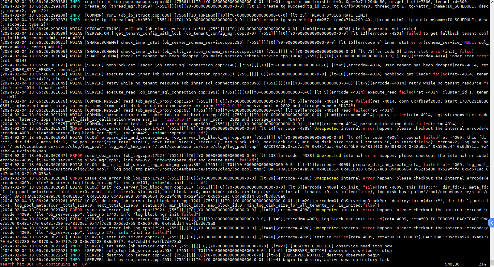 3.启动命令:/usr/local/oceanbase/bin/observer -r 127.0.0.1:2882:2881 -p 2881 -P 2882 -z zone1 -c 1 -d /opt/log/oceanbase/store/ -i lo -o __min_full_resource_pool_memory=1073741824,enable_syslog_recycle=True,enable_syslog_wf=False,max_syslog_file_count=4,memory_limit=8G,system_memory=3G,cpu_count=16,datafile_size=20G,log_disk_size=15G