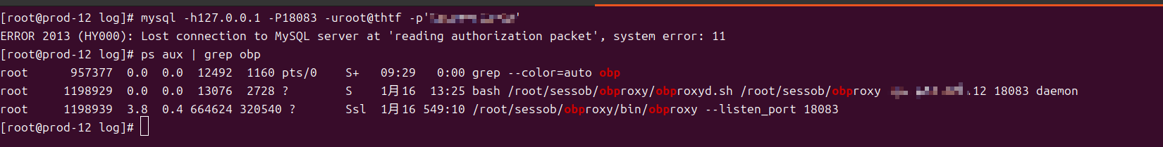 连接obproxy报错ERROR 2013 (HY000): Lost connection to MySQL server at ‘reading authorization packet’, system error: 2