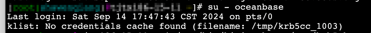 也就是说在执行su - oceanbase,会有额外的输出klist: No credentials cache found (filename: /tmp/krb5cc_1003)