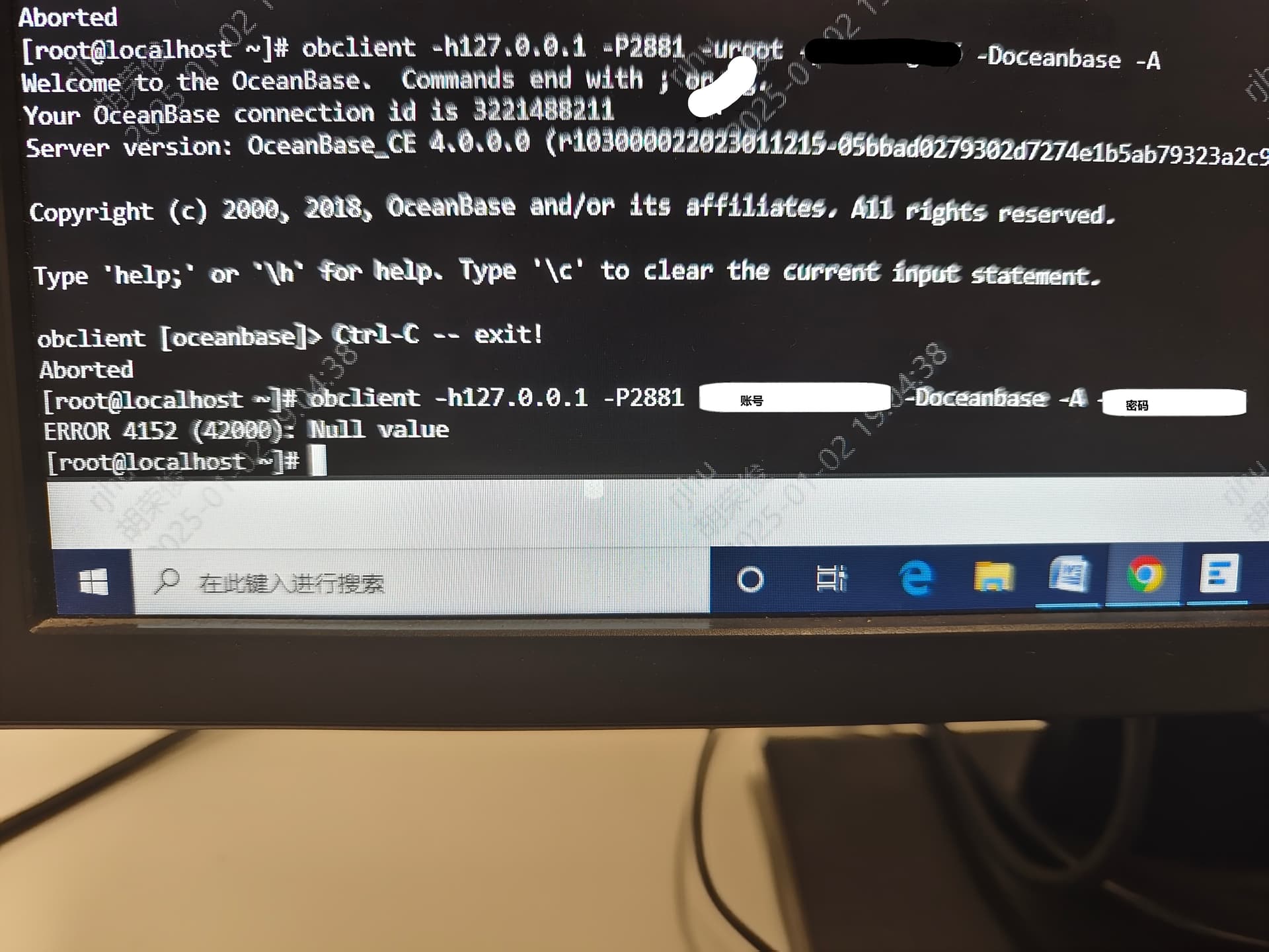 尝试登录租户无法登录,显示ERROR 4152(42000): Null value报错信息(版本为OceanBase_CE 4.0.0,0),目前无法登录,请各位大神指教,可能是登录超时得问题???