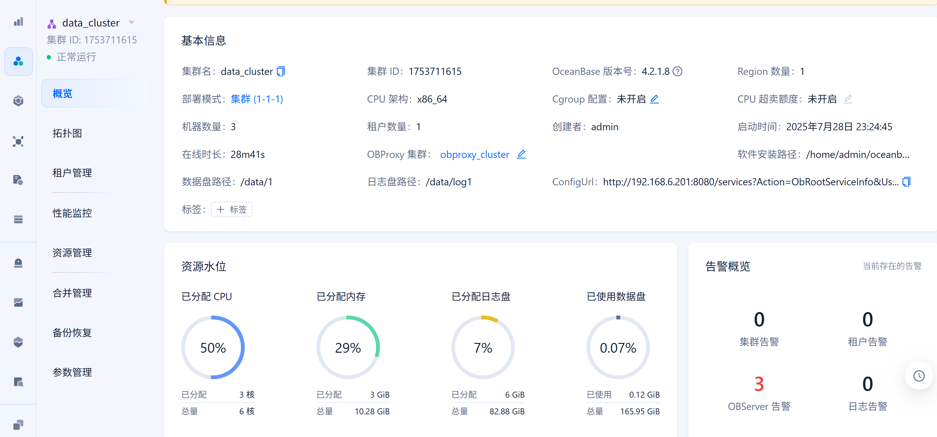 本人测试环境1(OCP 9G*1)+3(obproxy+observer 6G*3),observer实际可用约4G+,由于实际剩余可用小于5G,做如下测试