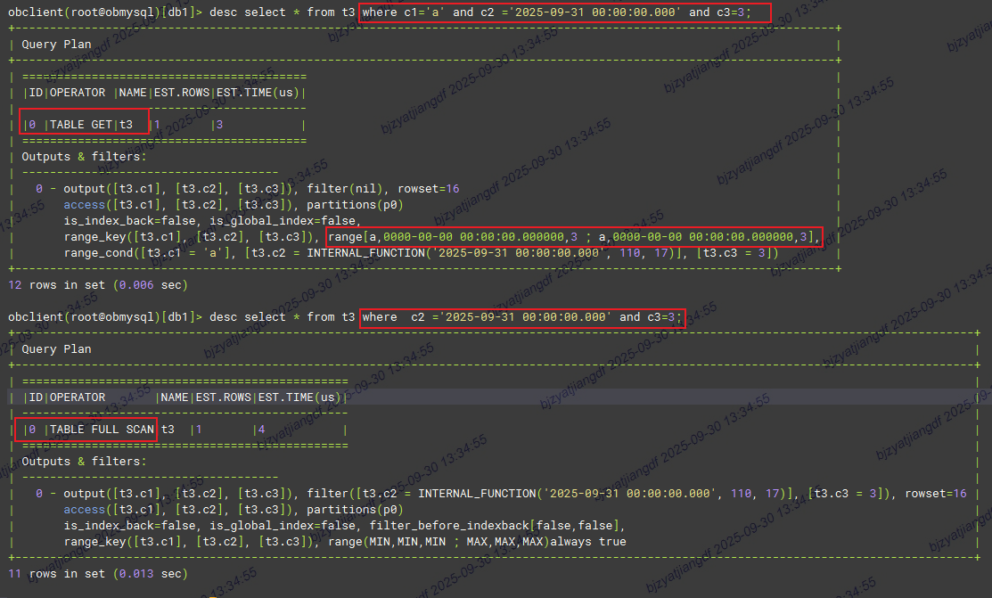 obclient(root@obmysql)[db1]> desc select * from t1 where 1=1 and c1 in (‘1.a’, ‘2.b’, ‘3.c’)