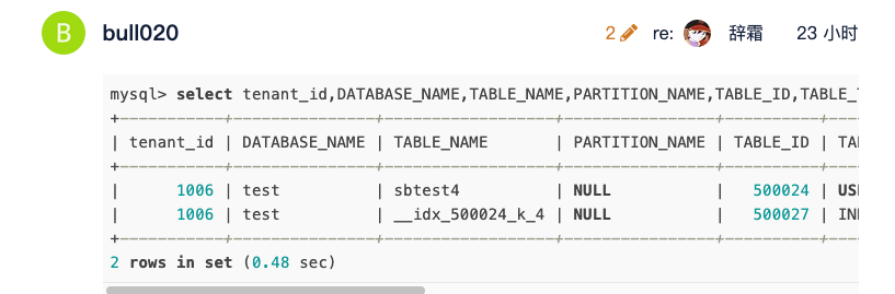 select tenant_id,DATABASE_NAME,TABLE_NAME,PARTITION_NAME,TABLE_ID,TABLE_TYPE,LS_ID,ZONE,SVR_IP,role from oceanbase.CDB_OB_TABLE_LOCATIONS where table_type=‘user table’ and role=‘leader’;