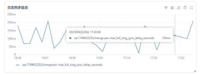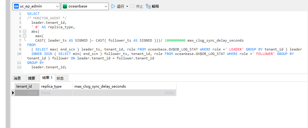 select /* MONITOR_AGENT */ leader.tenant_id, ‘0’ as replica_type, abs(max(CAST(leader_ts as SIGNED)-CAST(follower_ts as SIGNED)))/1000000000 max_clog_sync_delay_seconds from (select max(end_scn) leader_ts, tenant_id, role from oceanbase.GV$OB_LOG_STAT where role=‘LEADER’ group by tenant_id ) leader inner join (select min(end_scn) follower_ts, tenant_id, role from oceanbase.GV$OB_LOG_STAT where role=‘FOLLOWER’ group by tenant_id ) follower on leader.tenant_id=follower.tenant_id group by leader.tenant_id;