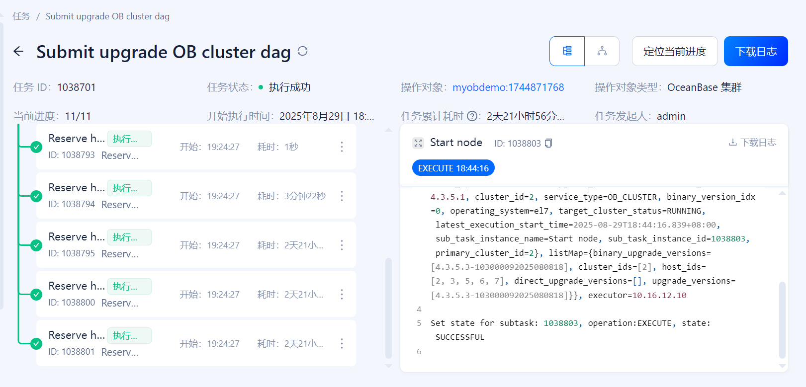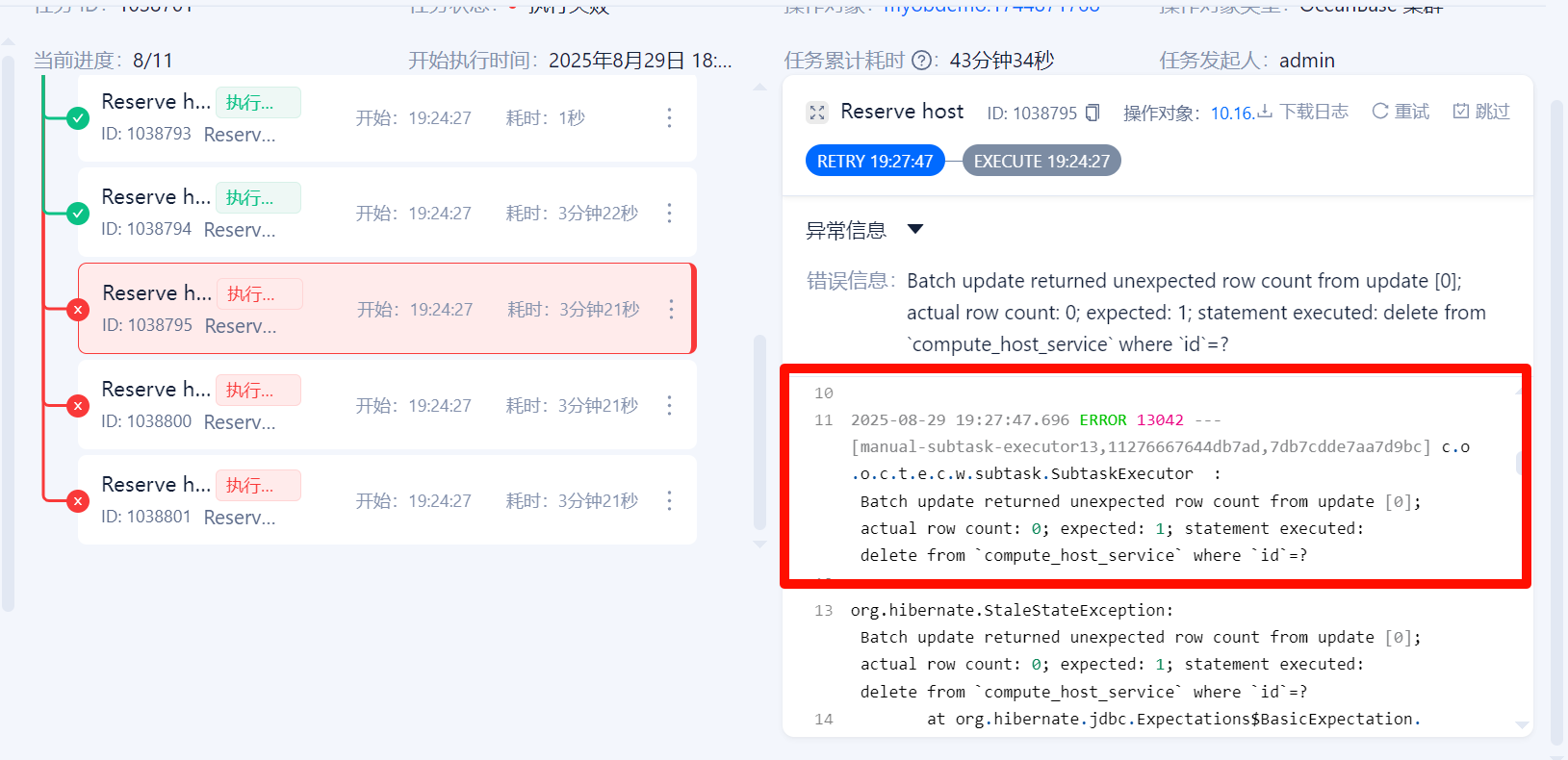 有一个已知bug:ob升级后,主机接口返回仍旧为原版本,任务重试应该可以通过,在OCP4.3.6修复,