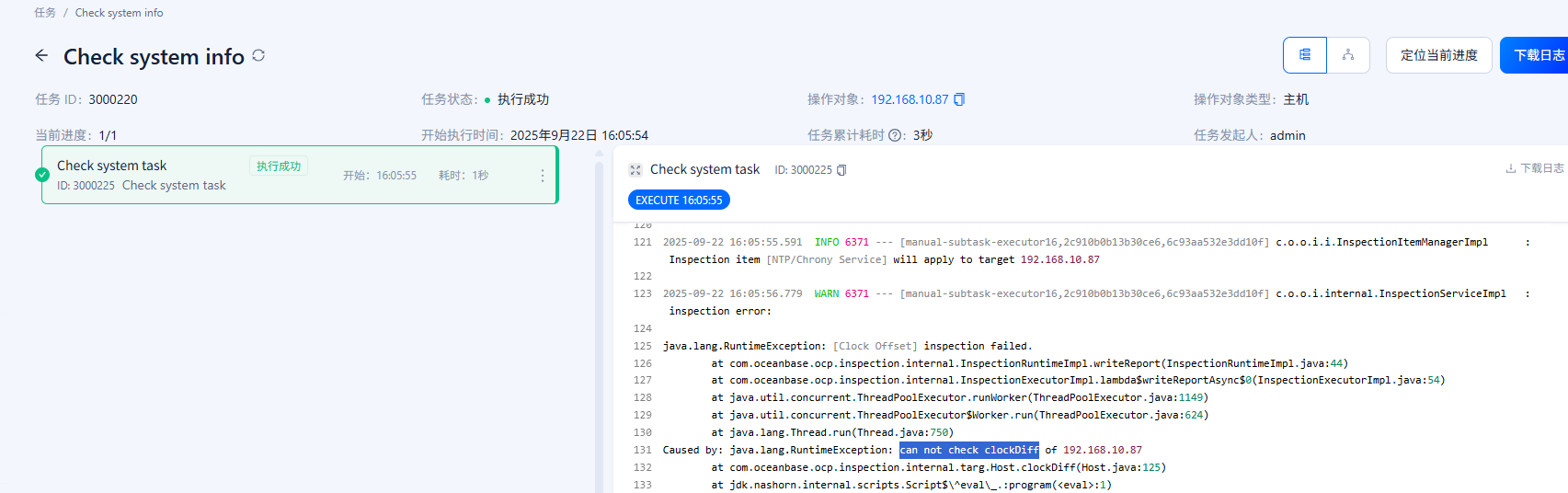 2025-09-22 16:17:12.850 WARN 6371 --- [inspection_task2,,] c.o.ocp.core.task.util.ClockDiff : Clock-diff failed. args=[192.168.10.86], exception={}. Please try other ocp.host.check.clock-diff.mode in System Parameters
