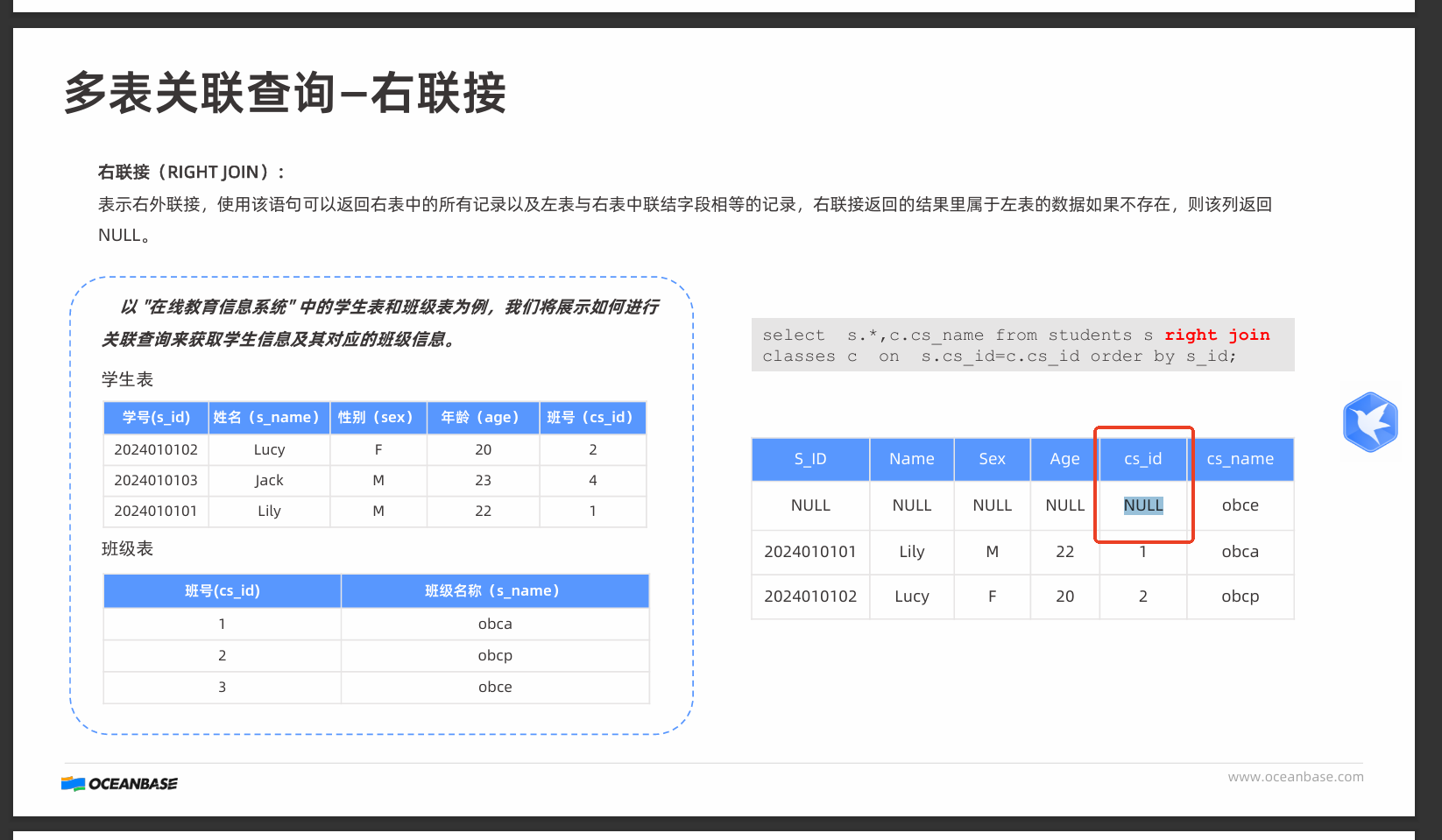 这个CS_ID是students表的cd_id字段,right join 是以右表的数据为准去关联左表,students表没有cs_id 为3的数据,那么关联的结果students表的字段都是空值,所以cs_id为NULL