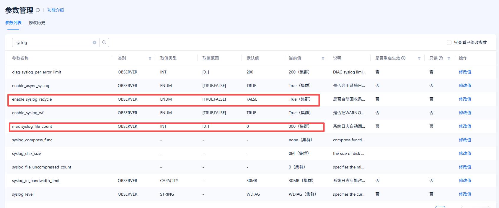 – 查看当前配置 SELECT * FROM oceanbase.GV$OB_PARAMETERS WHERE NAME IN (‘max_syslog_file_count’, ‘enable_syslog_recycle’, ‘syslog_disk_size’);