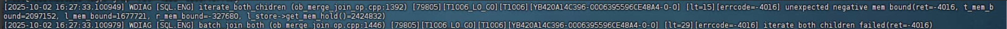 merge join 接自动内存管理的bug,在Left anti join场景下 低概率出现,l_store的内存使用超过了自动内存给出t_mem_bound限制,造成计算出来的r_mem_bound是负数。