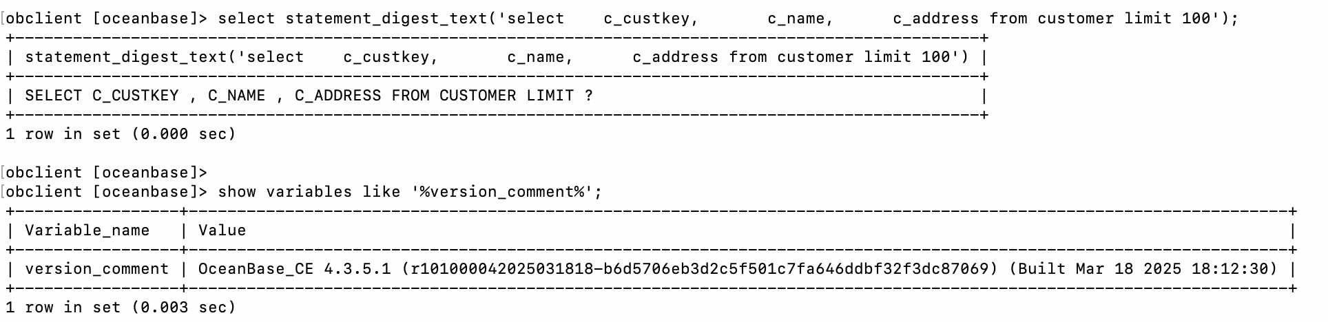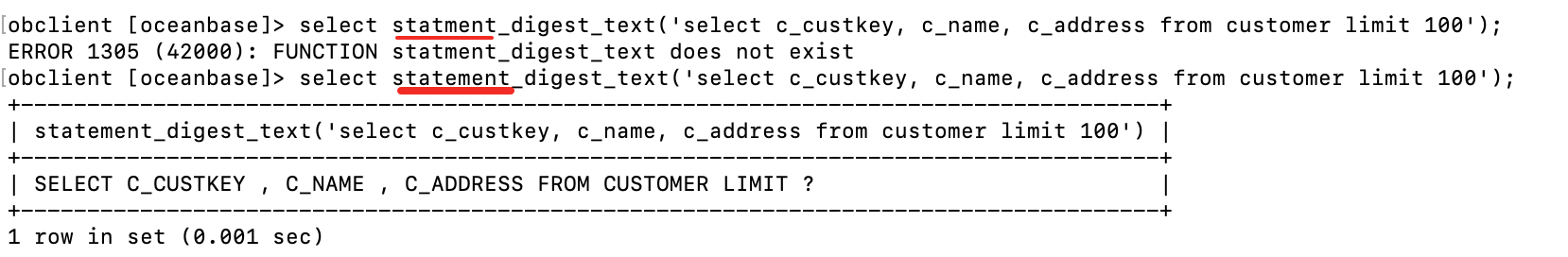 测试语句如下:select statment_digest_text(‘select c_custkey, c_name, c_address from customer limit 100’); 直接报错函数不存在。