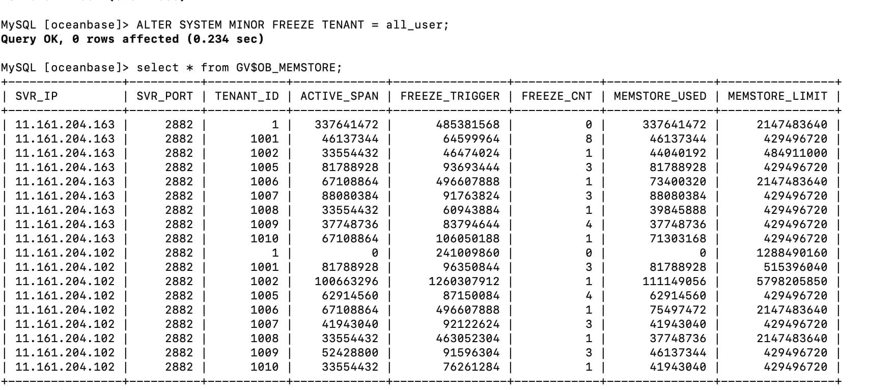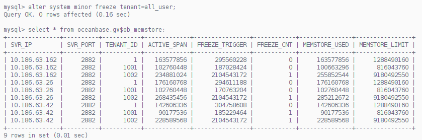 | SVR_IP | SVR_PORT | TENANT_ID | ACTIVE_SPAN | FREEZE_TRIGGER | FREEZE_CNT | MEMSTORE_USED | MEMSTORE_LIMIT |