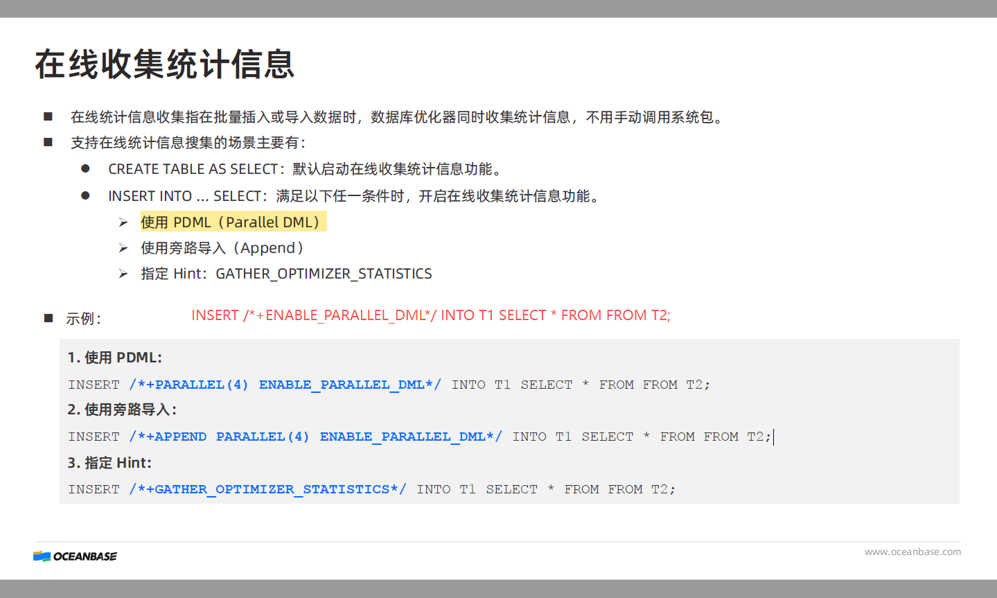 完整写法ENABLE_PARALLEL_DML paralle(x)会触发统计信息收集