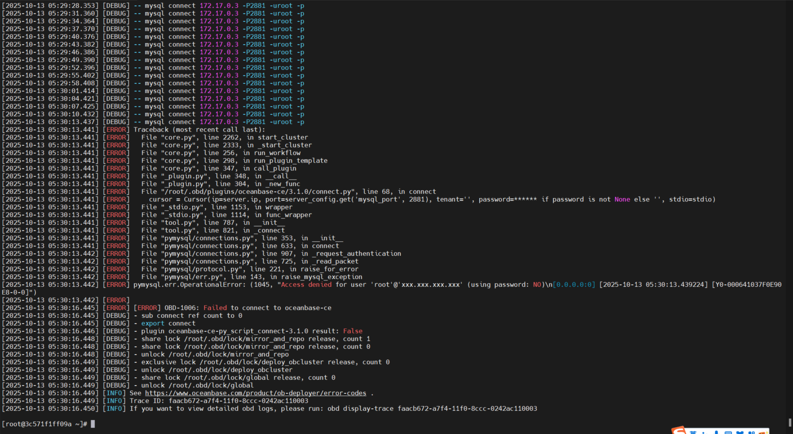 针对您提到的“OceanBase启动时报错’OBD-1006: Failed to connect to oceanbase-ce’,使用的是社区版,问题发生在容器重启或重新创建容器时,错误信息显示无法连接到172.17.0.3:2881,提示’Access denied for user ‘root’’”这一情况,我们可以通过obdiag工具来进行初步的日志采集和问题分析。