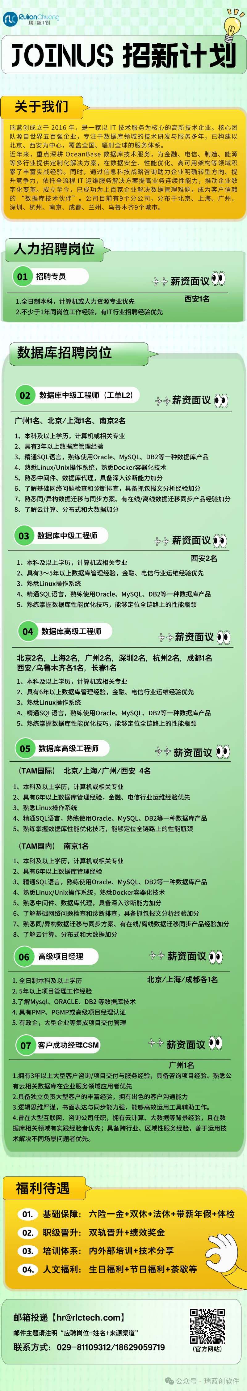 瑞蓝创社招通道火热开启,岗位覆盖多座城市、多个领域,数据库中级 / 高级工程师【含工单 L2、TAM 国际 / 国内方向】(西安/广州/北京/上海/南京/深圳/杭州/成都/乌鲁木齐/长春),高级项目经理(北京/上海/成都),客户成功经理CSM(广州),总有一款适合闪闪发光的你!