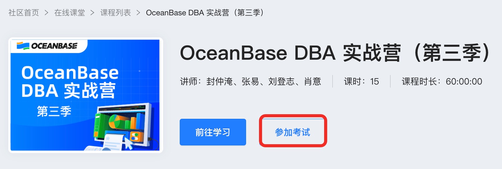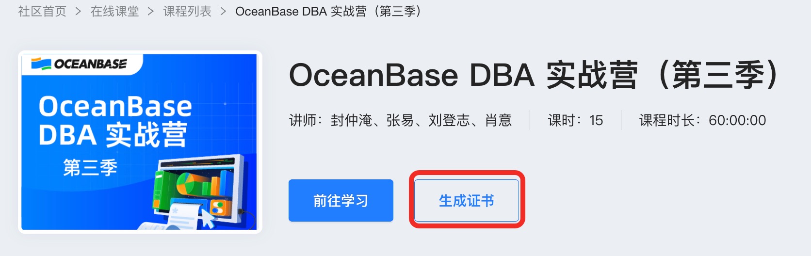 通过结课考试后,可以获得 OceanBase DBA 实战营(第三季)的结课证书。获取社区教程证书后,系统还会自动为您增加 60 积分。即完成第三季实战营课程,您可以获得 160 积分!