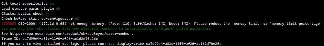 [ERROR] OBD-2000: (172.16.0.65) not enough memory. (Free: 11G, Buff/Cache: 14G, Need: 34G), Please reduce the `memory_limit` or `memory_limit_percentage`