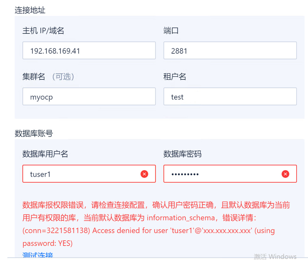 通过obclient和mysql 均可正常连接,通过ODC连接测试失败,提示“数据库报权限错误,请检查连接配置,确认用户密码正确,且默认数据库为当前用户有权限的库,当前默认数据库为 information_schema,错误详情:(conn=3221581405) Access denied for user ‘tuser1’@‘xxx.xxx.xxx.xxx’ (using password: YES)”;