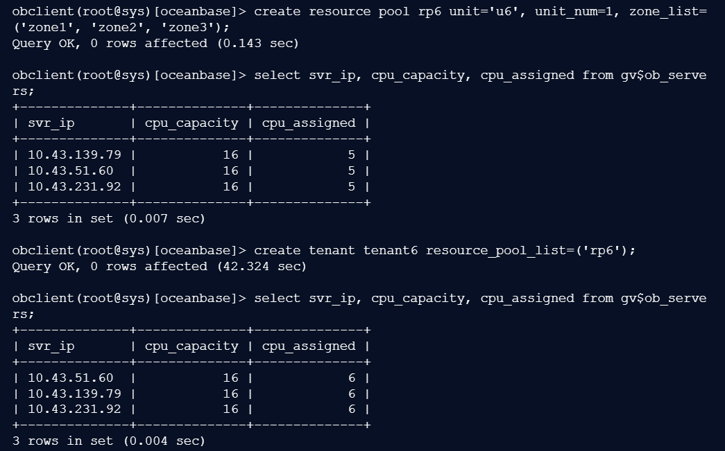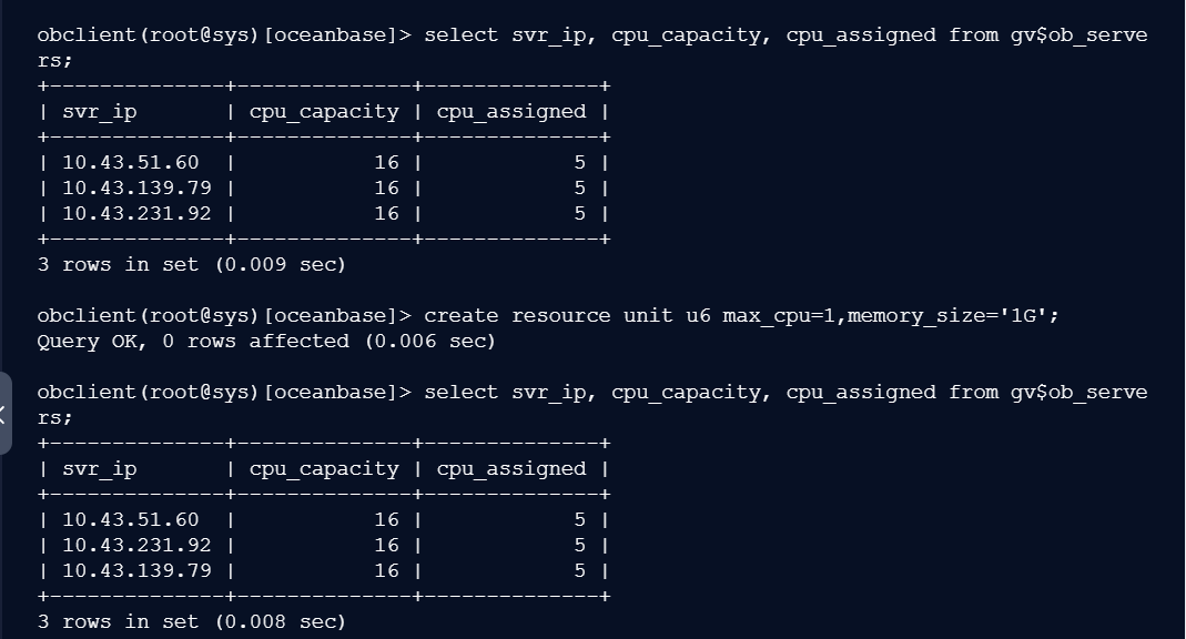 从创建租户的命令参数上可以判断,应该是在创建租户时才分配的资源。Replica_num决定了,决定了unit的数量,这时候才决定了observer上到底分配出多少CPU和内存。