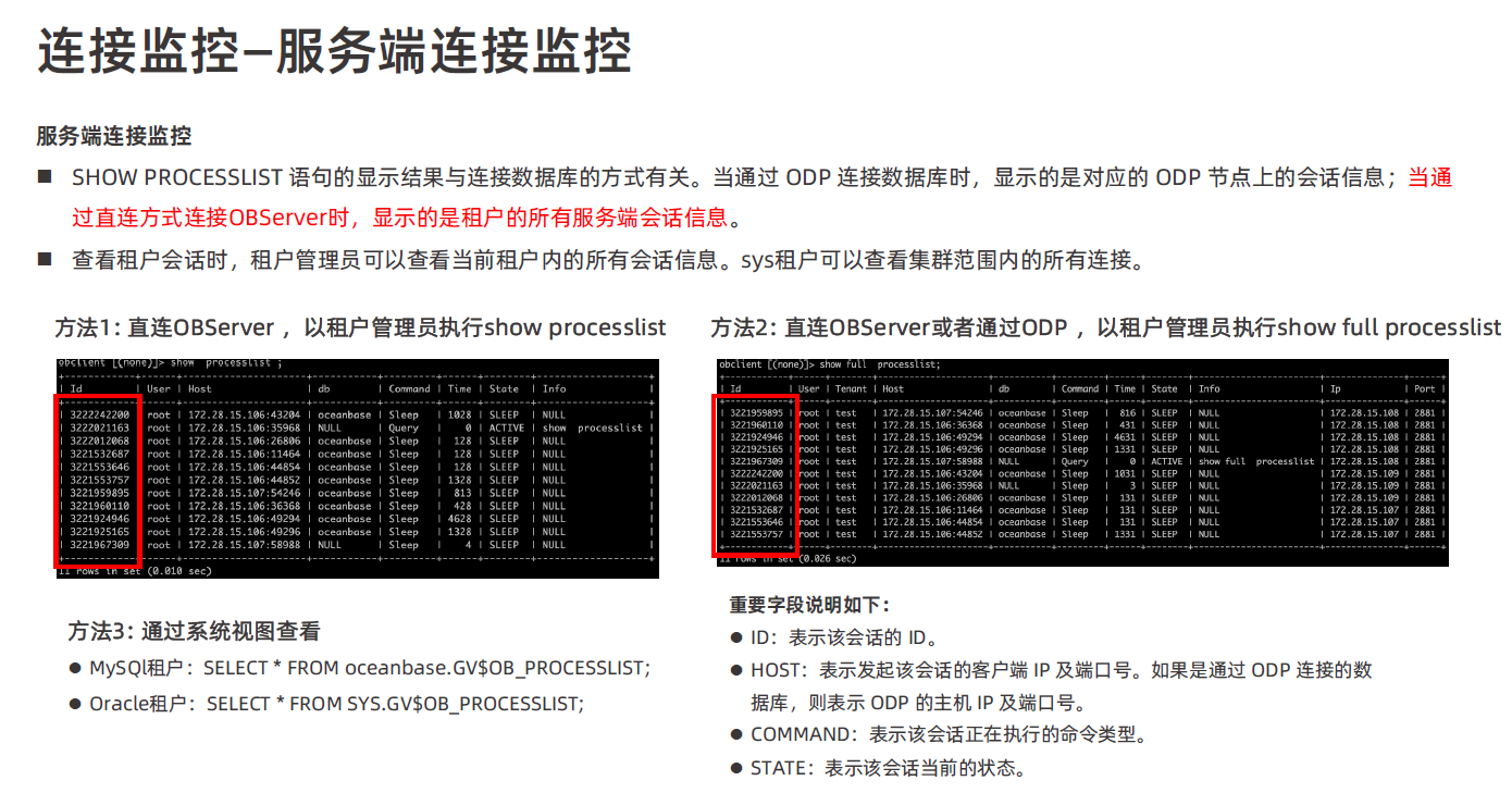 SHOW FULL PROCESSLIST:额外包含后端 OBServer 地址信息:-