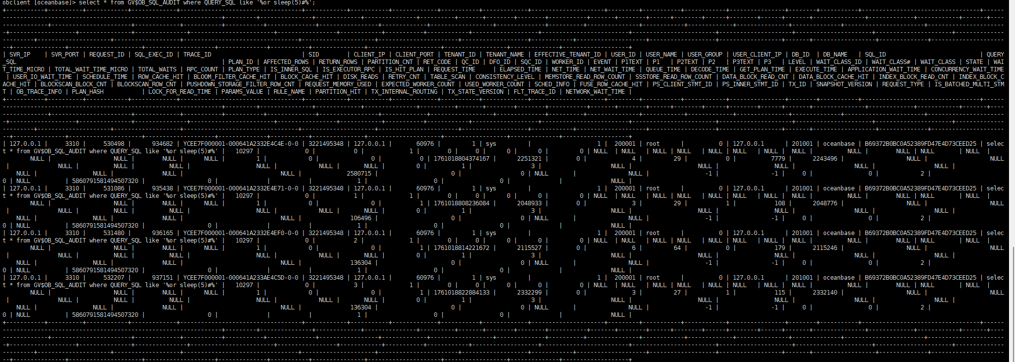 根据这个sql查一下 select * from GV$OB_SQL_AUDIT where QUERY_SQL like ’ %or sleep(5)#%’;