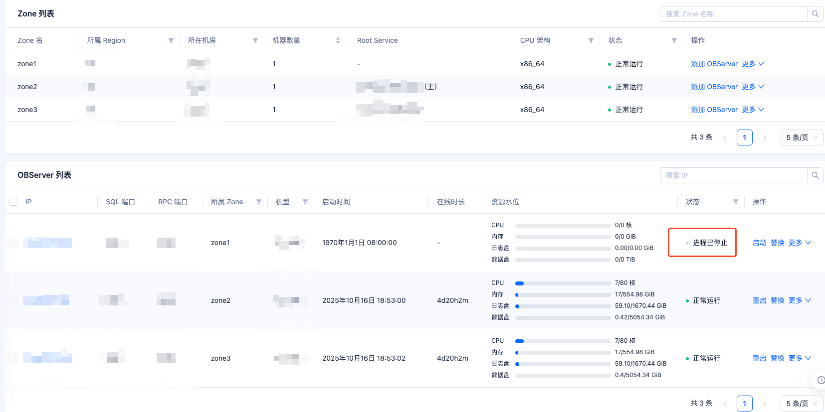 集群是 111 的架构,我在 ocp 中停止了 OBServer 列表中的一个 server1 ,这个 server1 对应的是 zone1,但是 Zone 列表中还是 active 状态的为什么?