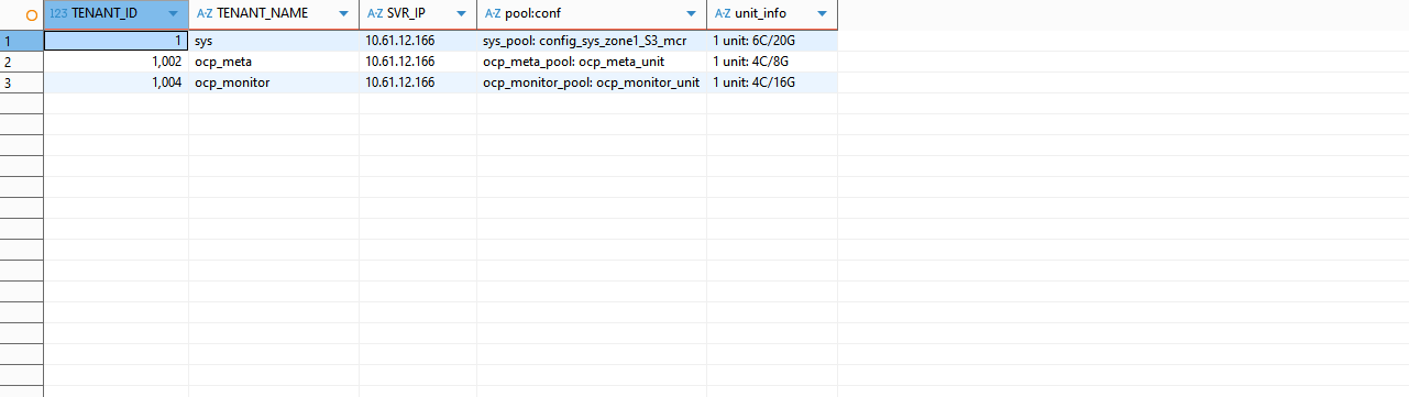 SELECT c.TENANT_ID, e.TENANT_NAME, f.SVR_IP,concat(c.NAME, ': ', d.NAME)`pool:conf`,concat(c.UNIT_COUNT, ' unit: ', d.min_cpu, 'C/', ROUND(d.MEMORY_SIZE/1024/1024/1024,0), "G") unit_info FROM DBA_OB_RESOURCE_POOLS c, DBA_OB_UNIT_CONFIGS d, DBA_OB_TENANTS e ,DBA_OB_UNITS f WHERE c.UNIT_CONFIG_ID=d.UNIT_CONFIG_ID AND c.TENANT_ID=e.TENANT_ID AND e.TENANT_ID=f.TENANT_ID AND c.RESOURCE_POOL_ID=f.RESOURCE_POOL_ID ORDER BY c.TENANT_ID;