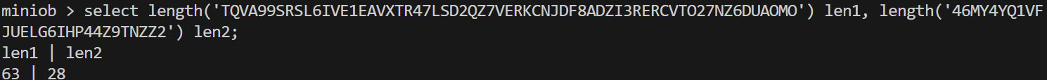 select length('TQVA99SRSL6IVE1EAVXTR47LSD2QZ7VERKCNJDF8ADZI3RERCVTO27NZ6DUAOMO') len1, length('46MY4YQ1VFJUELG6IHP44Z9TNZZ2') len2;