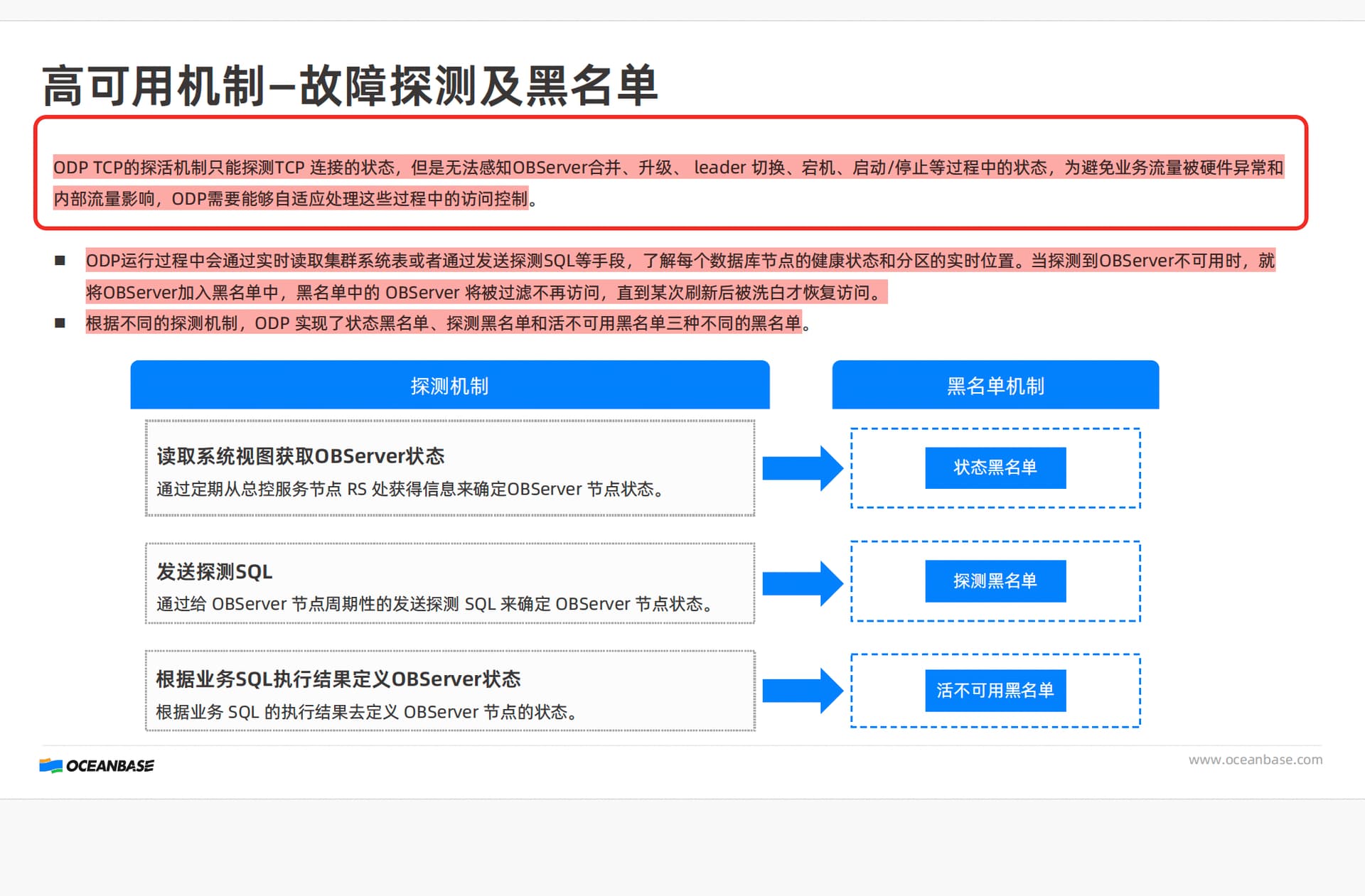 B 当探测到OBServer不可用时,ODP就将OBServer加入黑名单中,黑名单中的 OBServer 将被过滤不再访问
