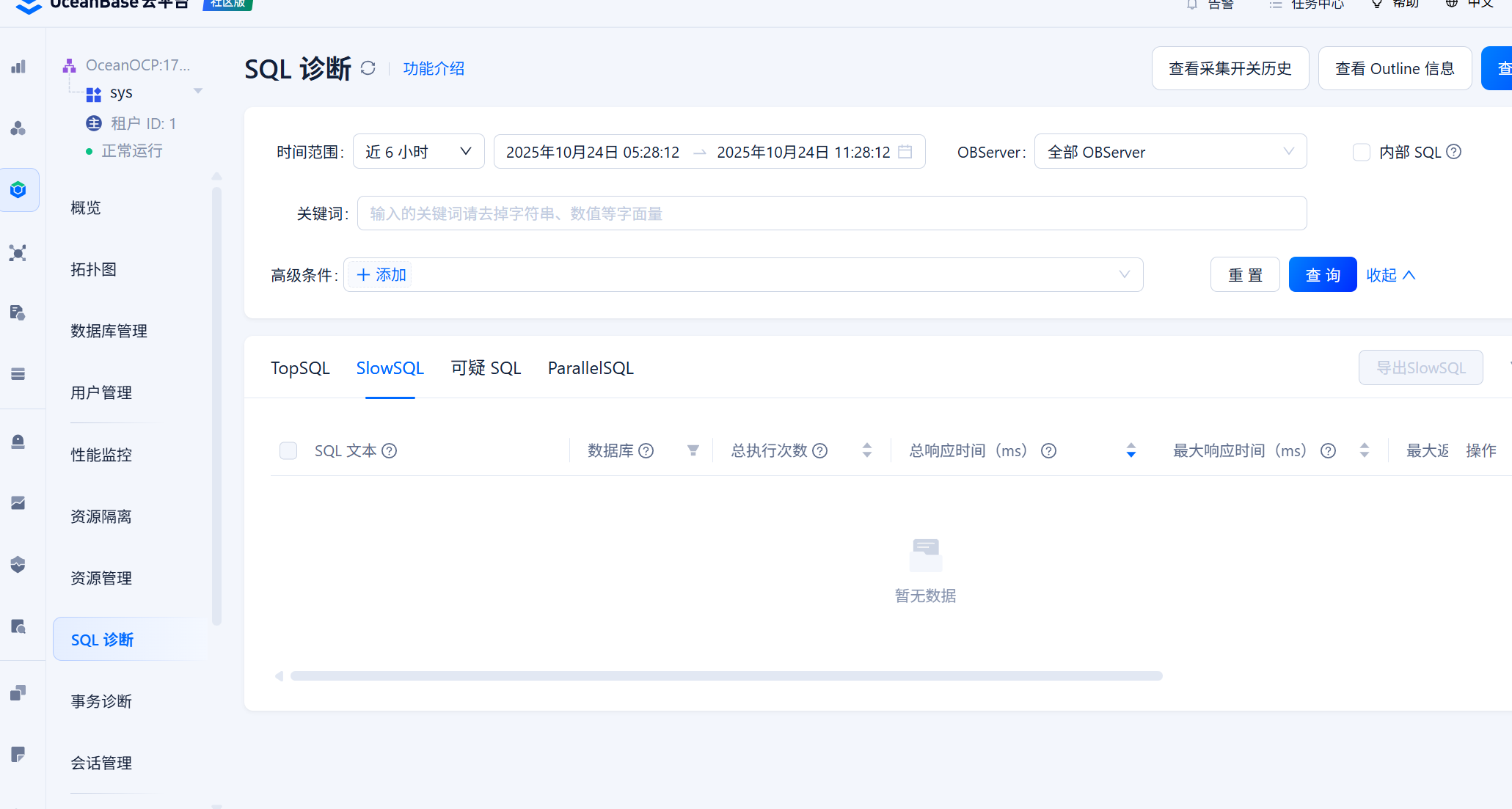 3.OceanBase OCP 服务中,这个 sql 诊断 页面。系统参数我看都设置 ,有些sql 很慢,查询慢sql 列表 ,但这边不显示数据。不知道是不是哪设置有问题
