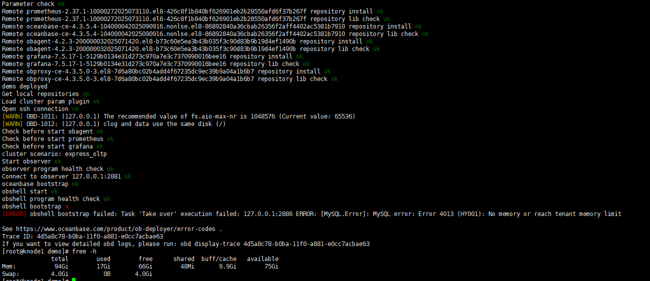 【问题描述】麒麟V10 + 鲲鹏916安装,obd demo报错,free -显示明明有内存66G,还提示内存不足