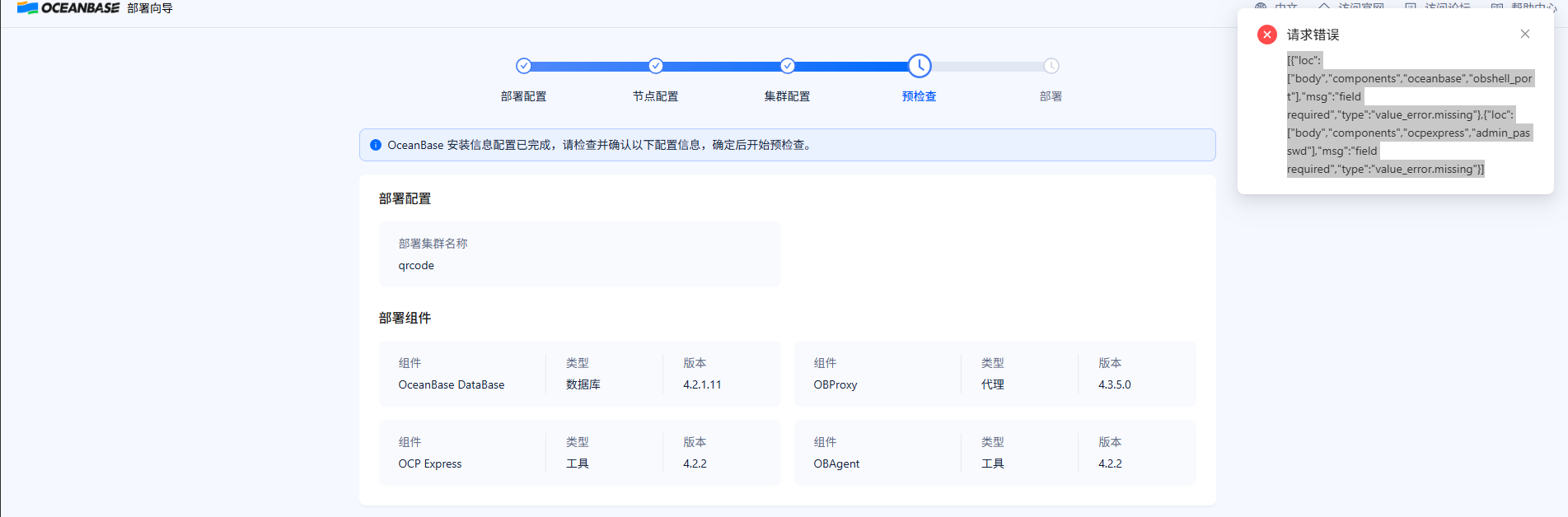 【附件及日志】[{“loc”:[“body”,“components”,“oceanbase”,“obshell_port”],“msg”:“field required”,“type”:“value_error.missing”},{“loc”:[“body”,“components”,“ocpexpress”,“admin_passwd”],“msg”:“field required”,“type”:“value_error.missing”}]
