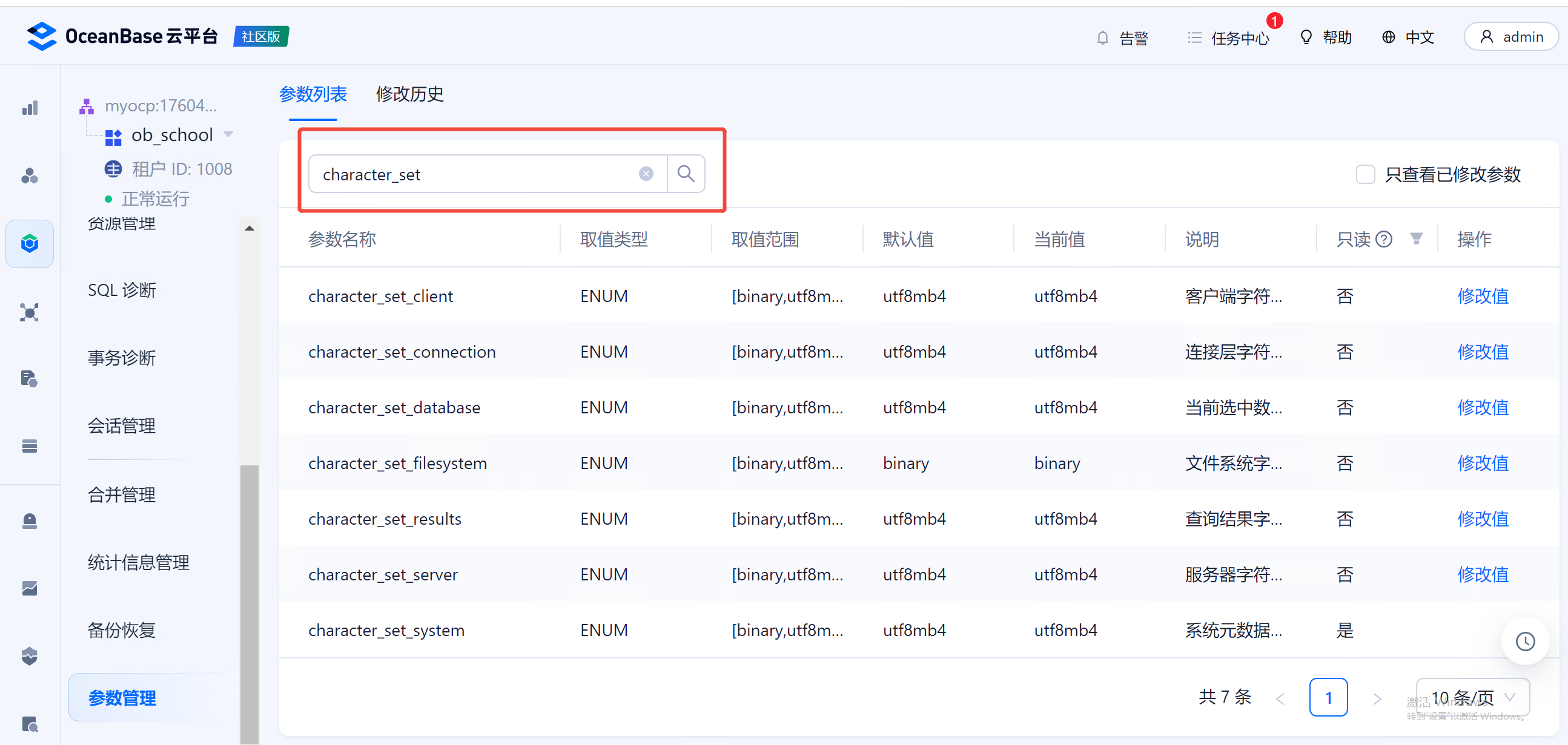 当 character_set_database 与创建租户时设置的字符集不一致时,创建数据库时会以 character_set_database 系统变量的值作为默认字符集