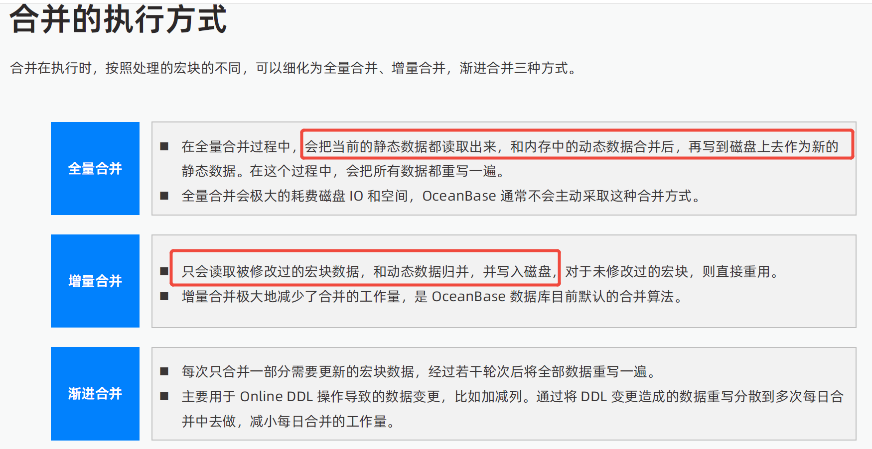 - 增量合并并不是在原文件尾部追加数据。而是选择性地读取和处理被修改过的宏块数据,与内存中的动态数据合并后写入新的文件。这种方式不仅提高了合并效率,还避免了读取和处理大量未修改的数据,从而加快了合并速度。