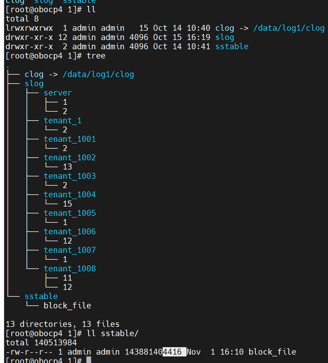 store 是数据文件目录,包含了 clog、slog、sstable 这 3 个子目录。其中 clog、slog 是事务日志目录,slog 存储静态数据写入的事务日志,clog 存储动态数据写入的事务日志。sstable 是基线数据目录。sstable 目录下会有一个 block_file,这个文件在 OBServer 节点启动后就会被创建,文件的大小由 datafile_size 或 datafile_disk_percentage 控制。