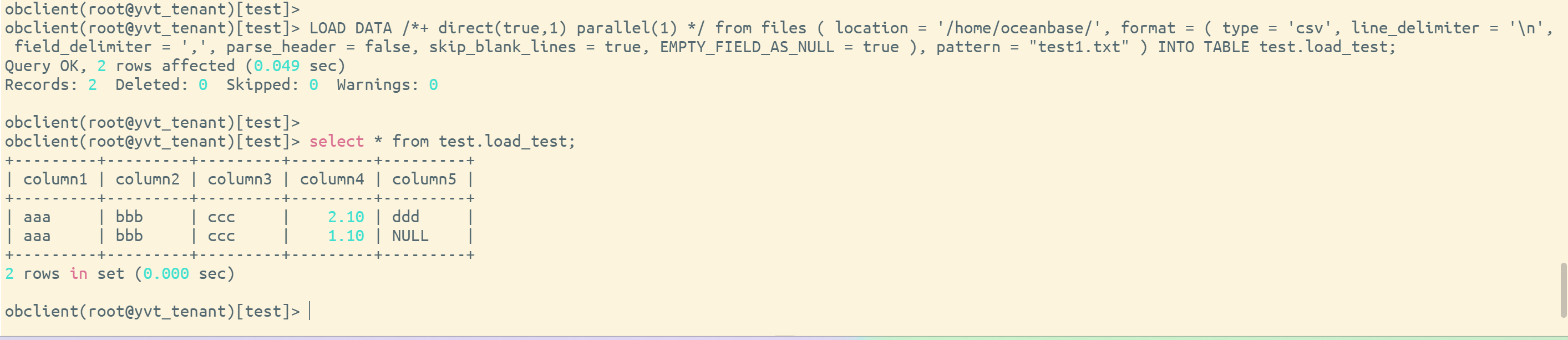LOAD DATA /*+ direct(true,1) parallel(1) */ from files ( location = '/home/oceanbase/', format = ( type = 'csv', line_delimiter = '\n', field_delimiter = ',', parse_header = false, skip_blank_lines = true, EMPTY_FIELD_AS_NULL = true ), pattern = "test.txt" ) INTO TABLE test.load_test;