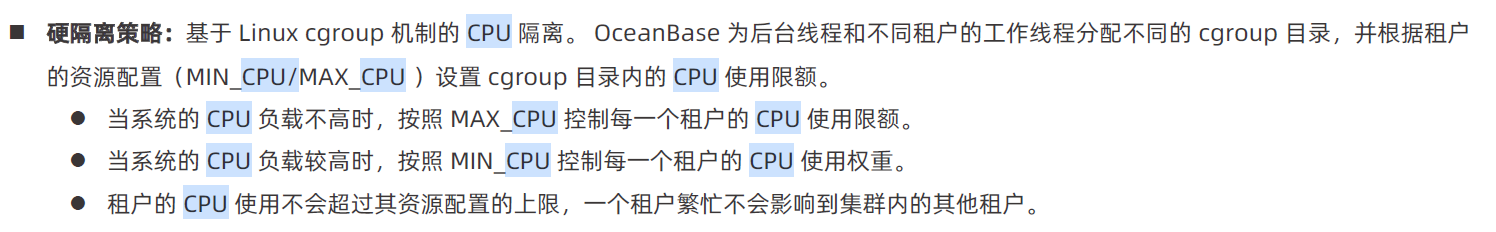 例如,如果一个租户的 max_cpu 设置为 4c,min_cpu 设置 2c,那么系统非常繁忙时候,该租户的 CPU 使用率也不会超过 4c,但是可以保证一定可以分到 2c的资源