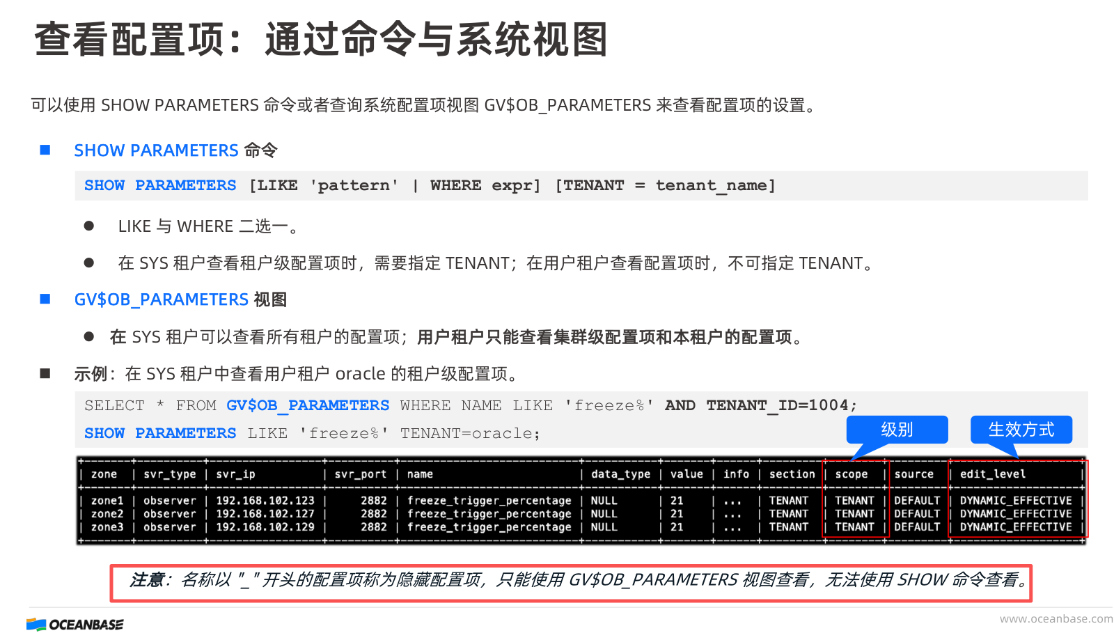 OceanBase中_rowset_enable这类参数值怎么查看?只能从gv$ob_parameters视图表中查看,使用show parameters like ''为何查看不了?出于什么目的?