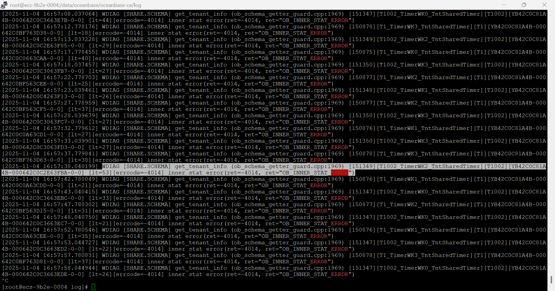 部署的一个集群,重启后一直报错WDIAG [SHARE.SCHEMA] get_tenant_info (ob_schema_getter_guard.cpp:1969) [151349][T1002_TimerWK2_TntSharedTimer][T1002][YB42C0C81A4B-000642C0C2E63FBA-0-0] [lt=53][errcode=-4014] inner stat error(ret=-4014, ret=“OB_INNER_STAT_ERROR”),请问是什么原因呢?需要怎么解决?