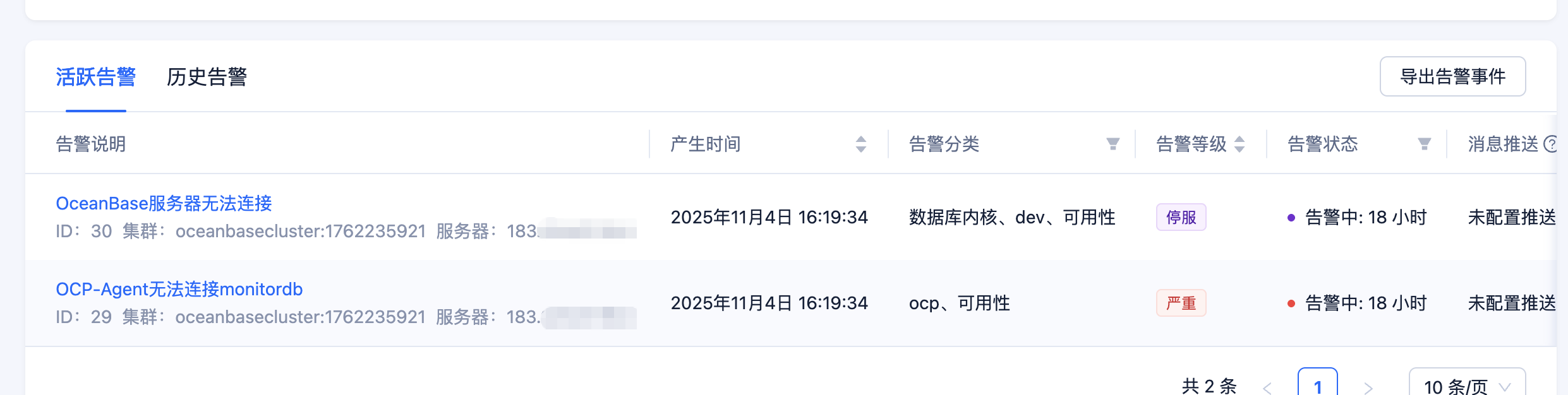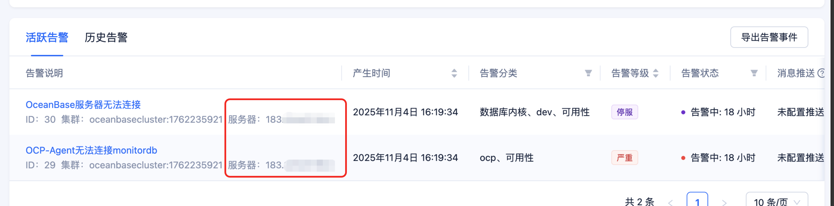 使用 OCP 接管 OceanBase 集群后,告警 “OceanBase 服务器无法连接”,且集群列表中的告警信息显示停服,但实际并未停服,尝试重装 Agent、OCP 均无法解决。