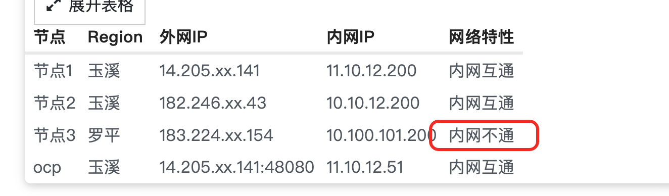 | 节点3 | 罗平 | 183.224.xx.154 | 10.100.101.200 | 内网不通 |