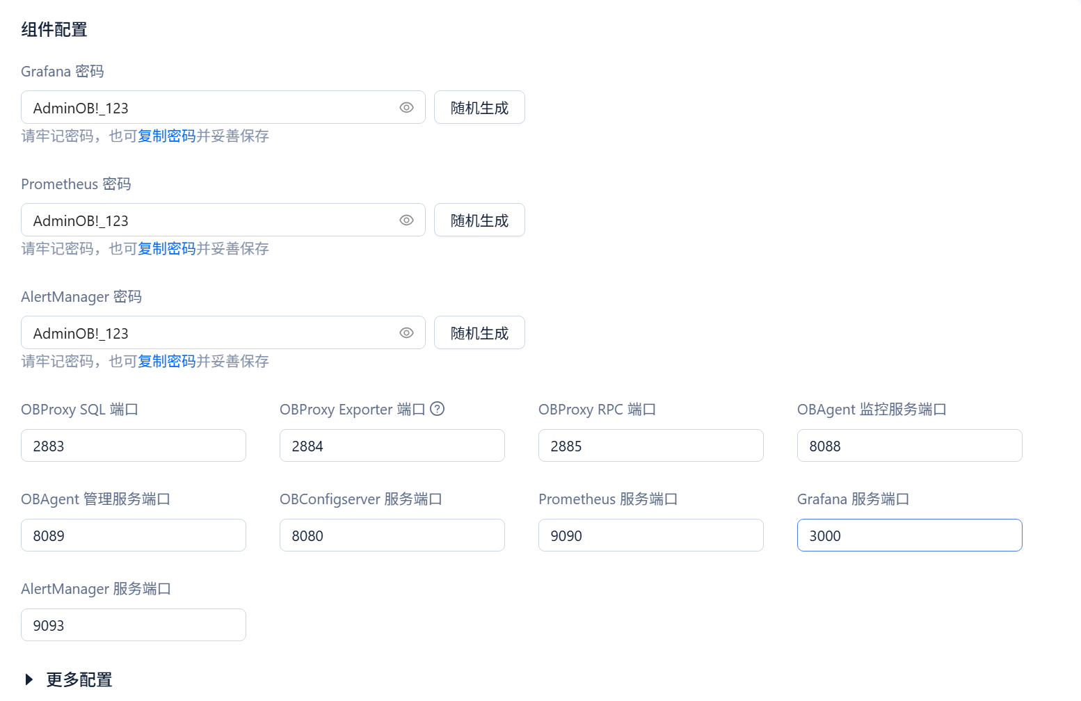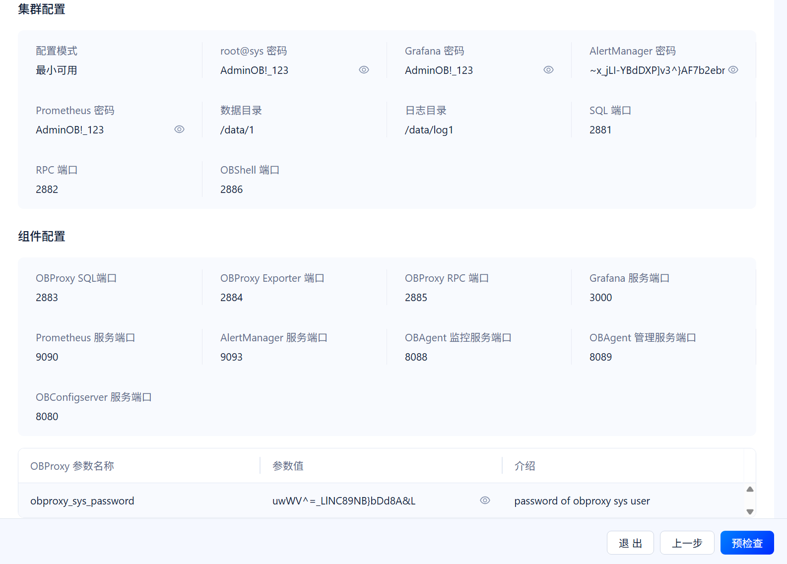 OB-Dashboard创建集群时,输入内容不能再次修改,设置了AlertManager 密码,在预检的结果显示是自动生成的强制密码。AlertManager节点输入192.168.56.140 ,会自动修改为192.168.56.141。点击上一步去修改后,再点击“下一步”后还是原来的内容。
