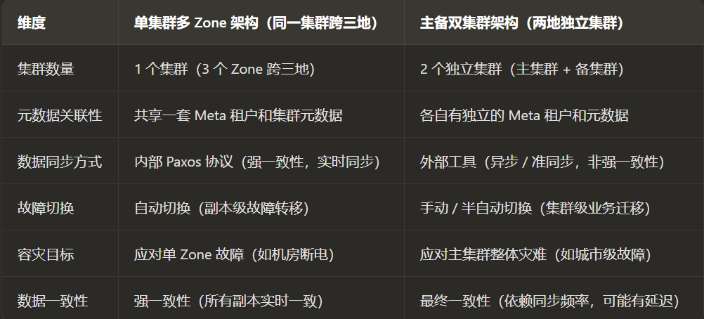 一个集群多zone,分别在多个机房。机房之是有的网络延迟不能高于10ms,如果高于这个延迟只能做主备集群,异步同步。