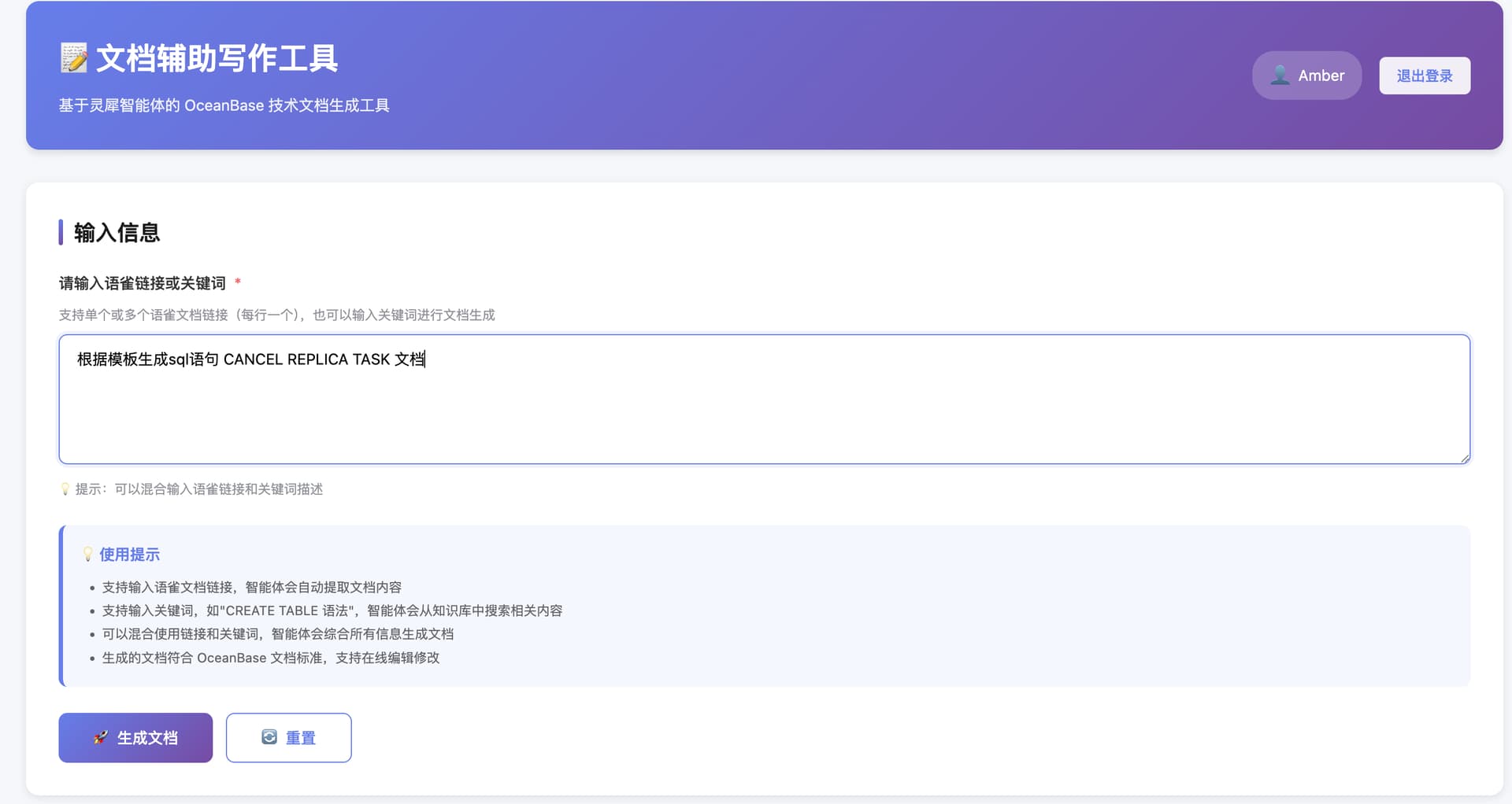 最近在研究怎么用 AI 写 OceanBase 数据库的文档。目标是开发一个文档辅助写作工具,使用 AI 将开发人员的原始文档(如实现文档、提测文档等)转换为可用的用户文档。这个工具主要针对"黑屏"文档(内核文档、命令类文档),因为这类文档对控制台依赖度不高,更容易实现。