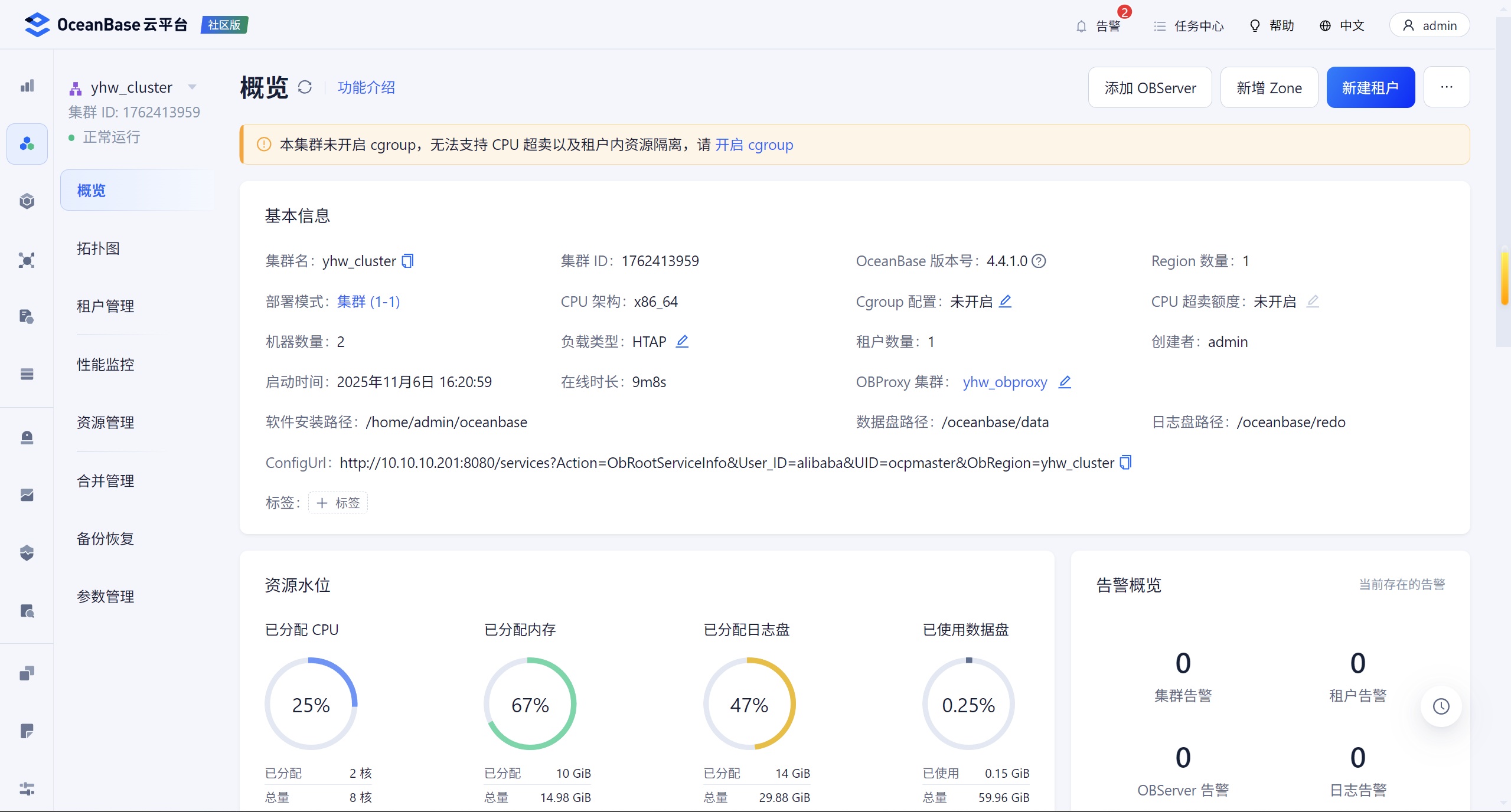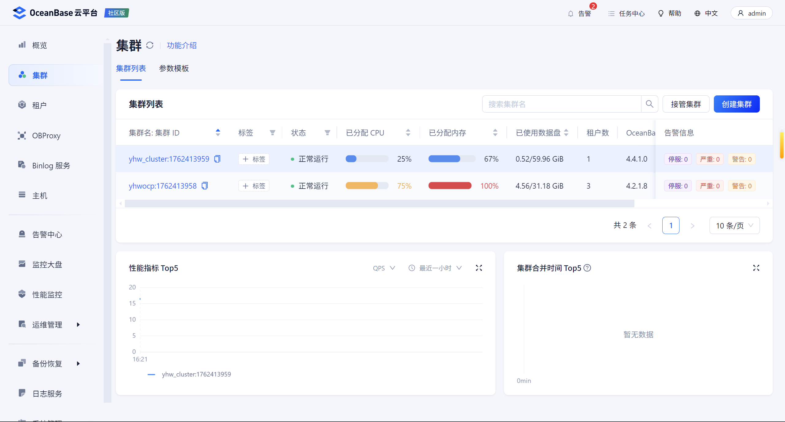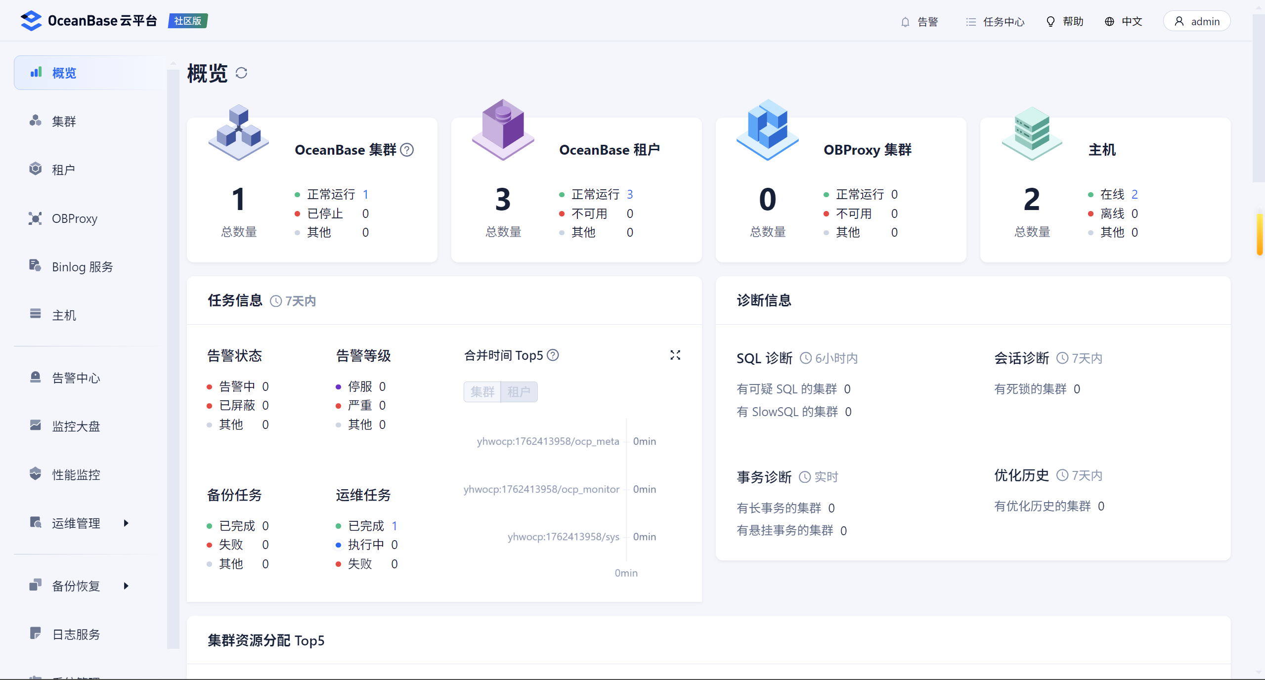使用OCP部署OB集群,整体还是比较流程简单的,只不过OCP本身耗费资源也不少。