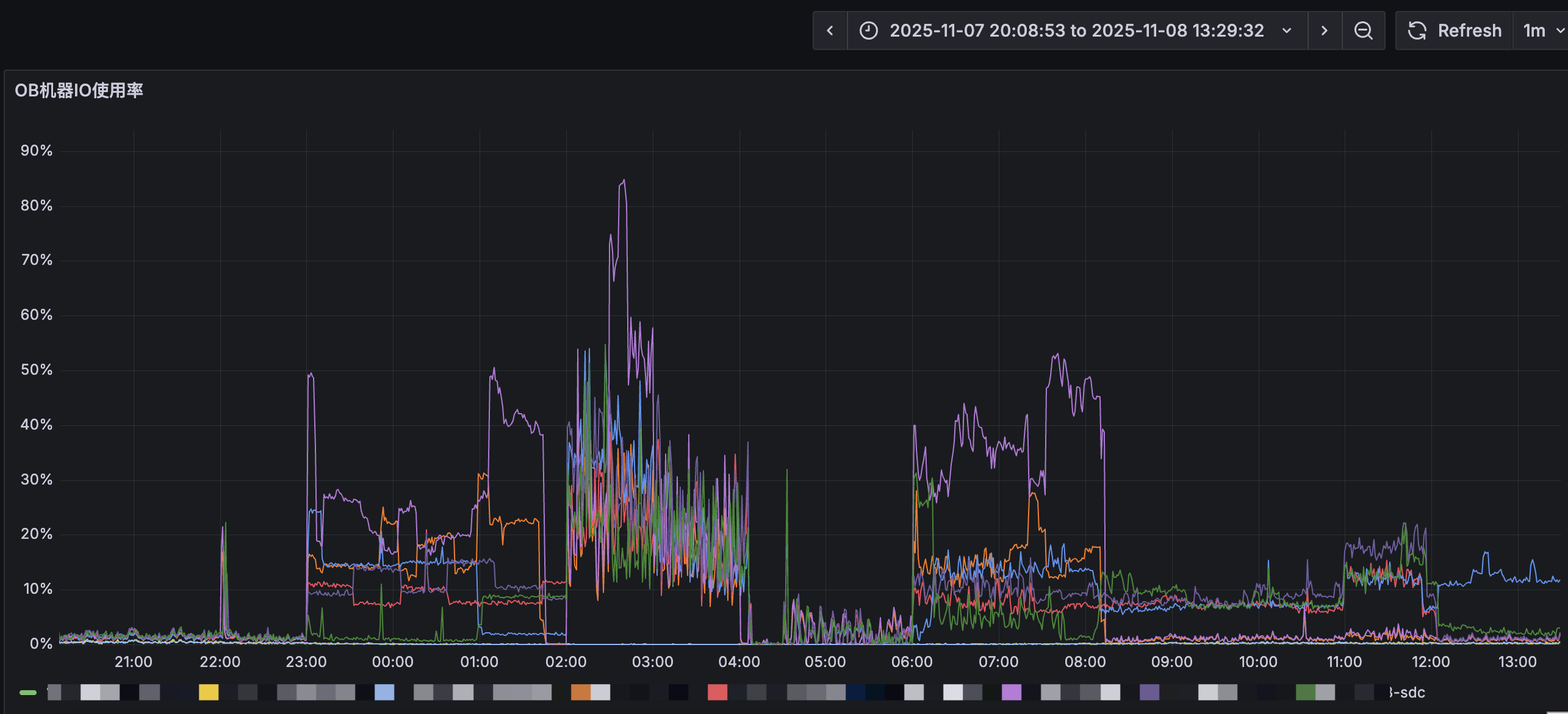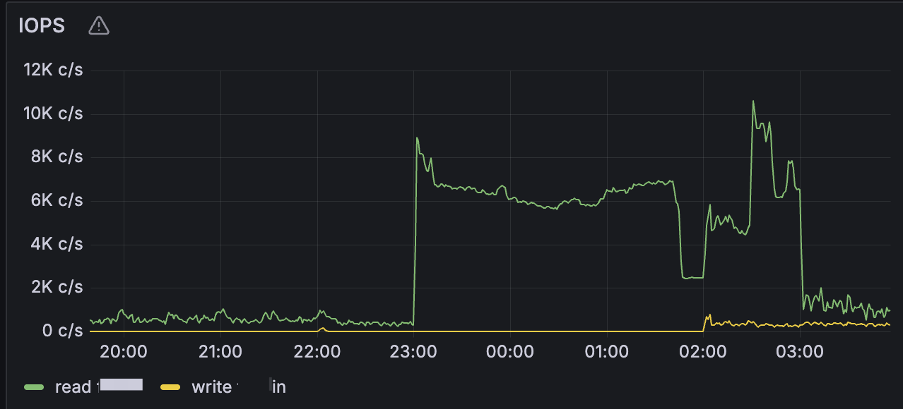 每晚从22点开始磁盘io就变高了,会一直持续到凌晨4点,其中2点开始会有合并到4点会结束合并,目前研发侧也没有定时任务,sql请求量晚上是低峰,数据备份是从4点半开始的