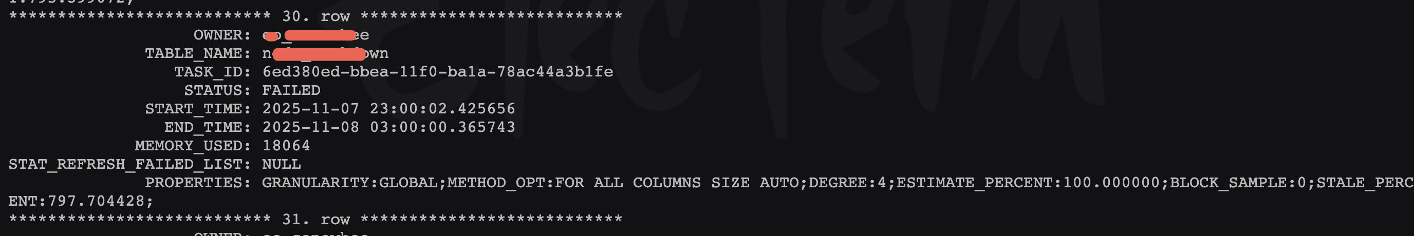 WHERE JOB_NAME LIKE ‘GATHER_STATS%’;