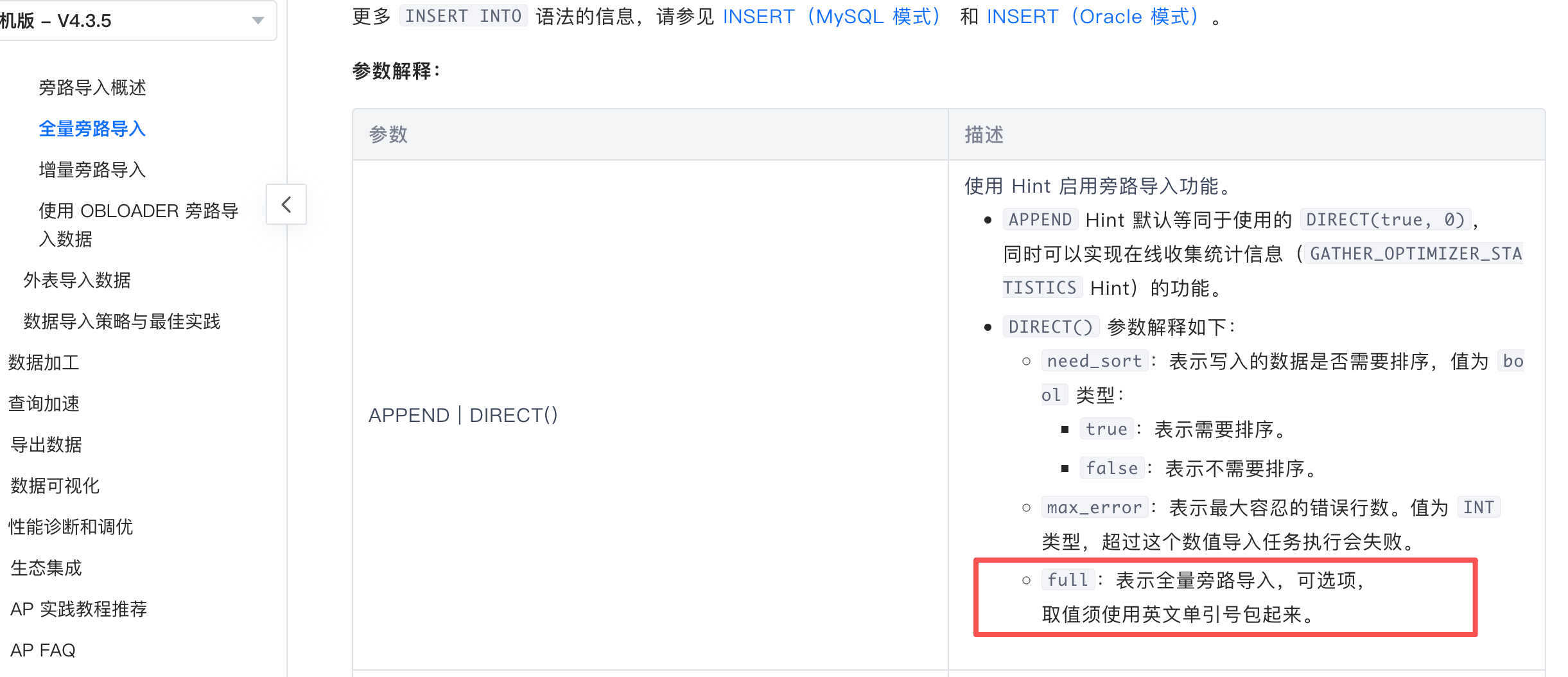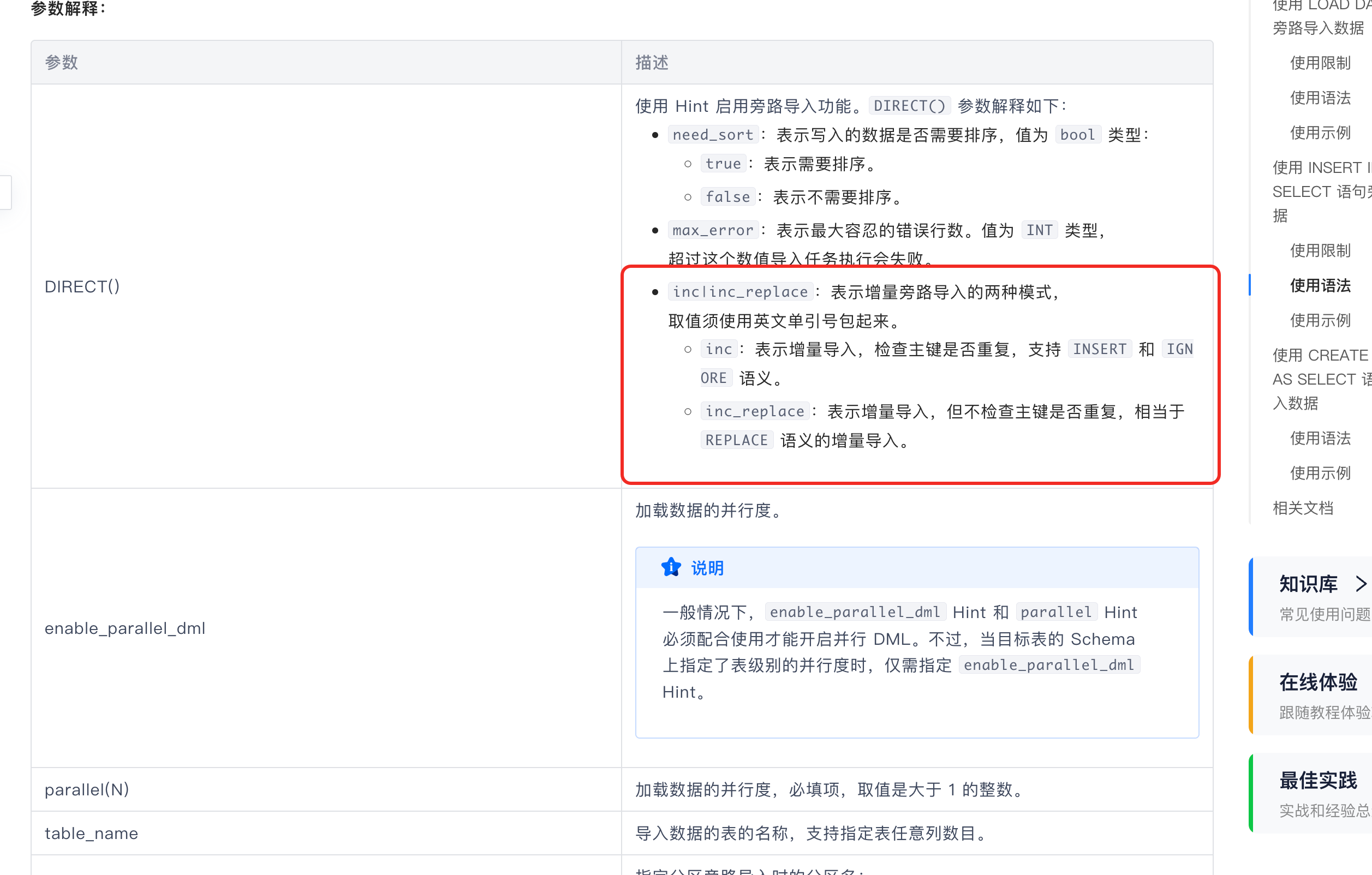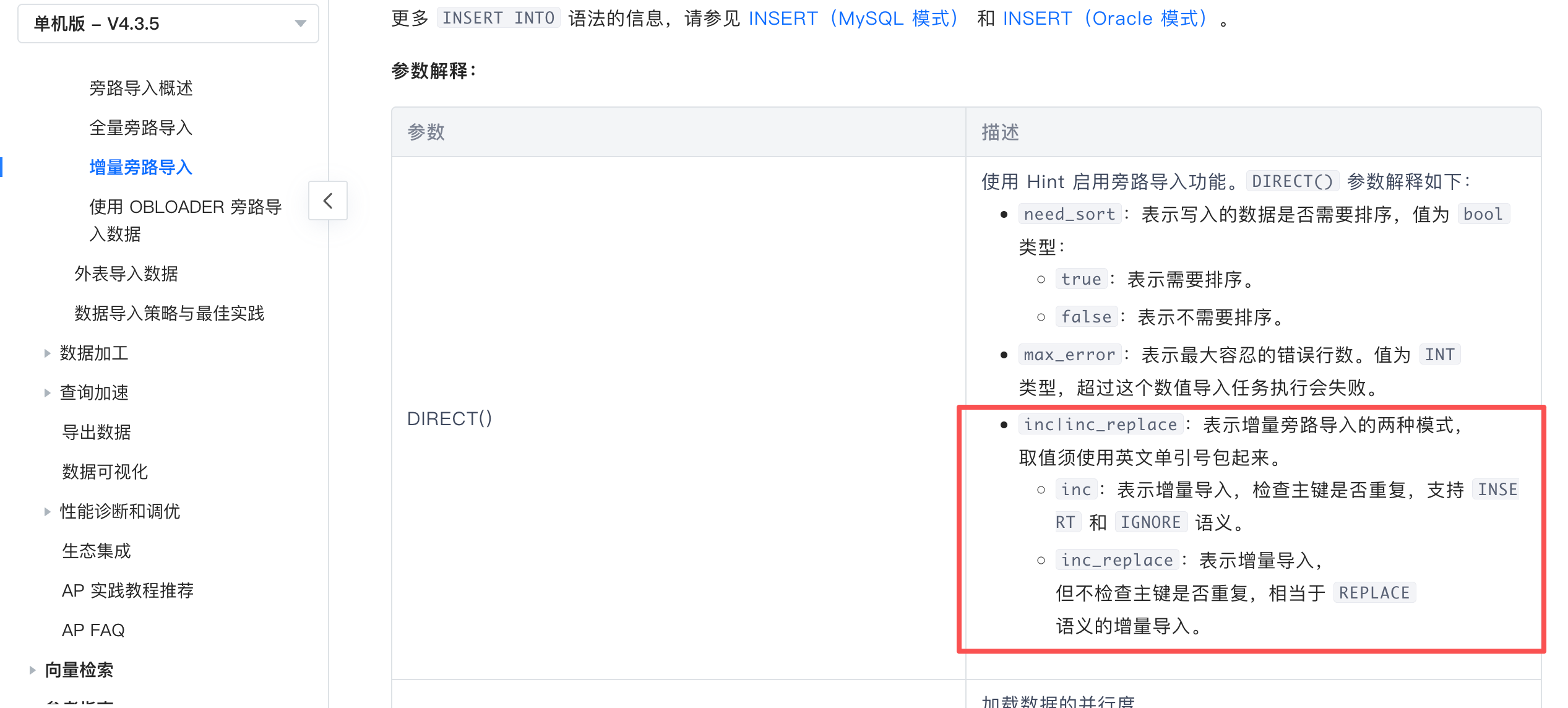 /+ direct(need_sort, max_errors_allowed, load_mode)/ 通过load_mode 来控制 load_mode 参数需要设置为 inc 或 inc_replace ,以启用增量旁路导入